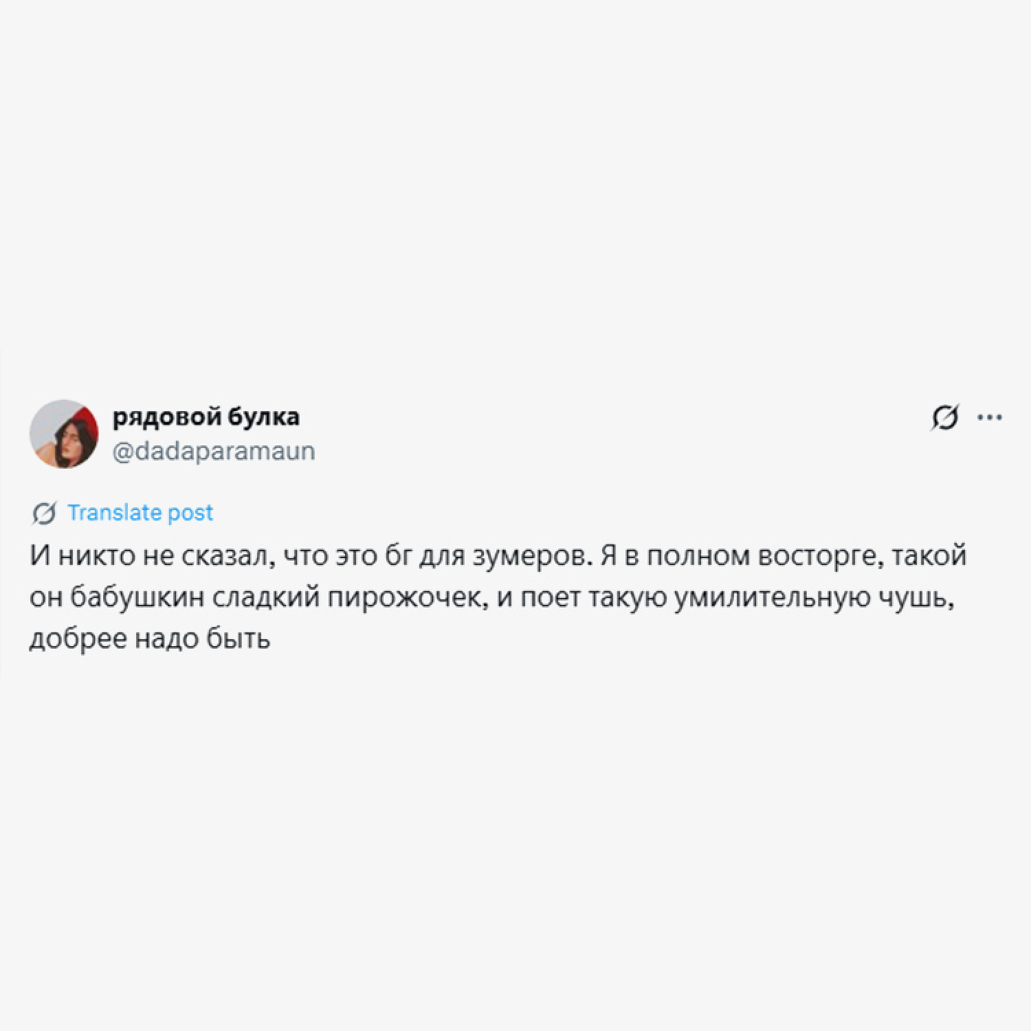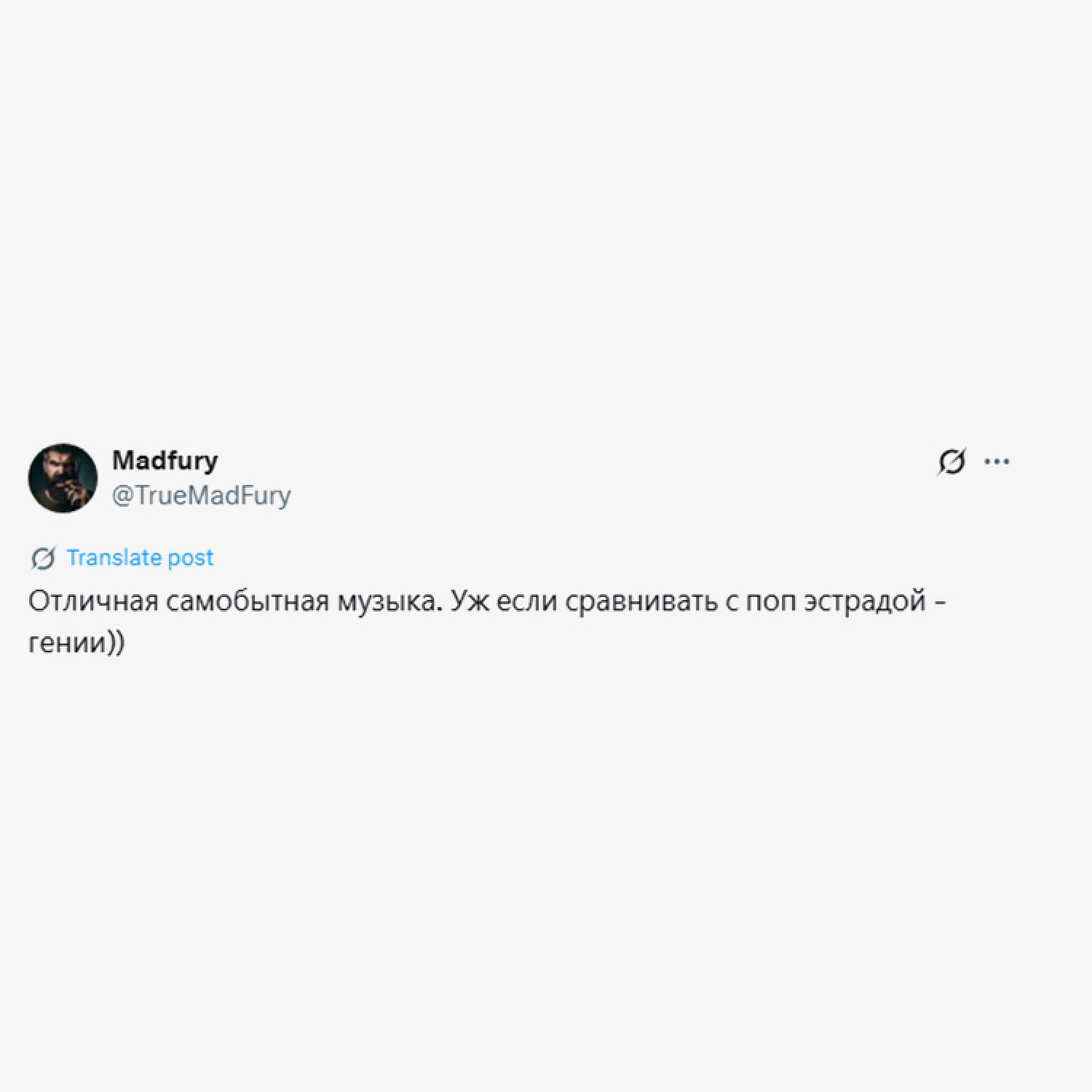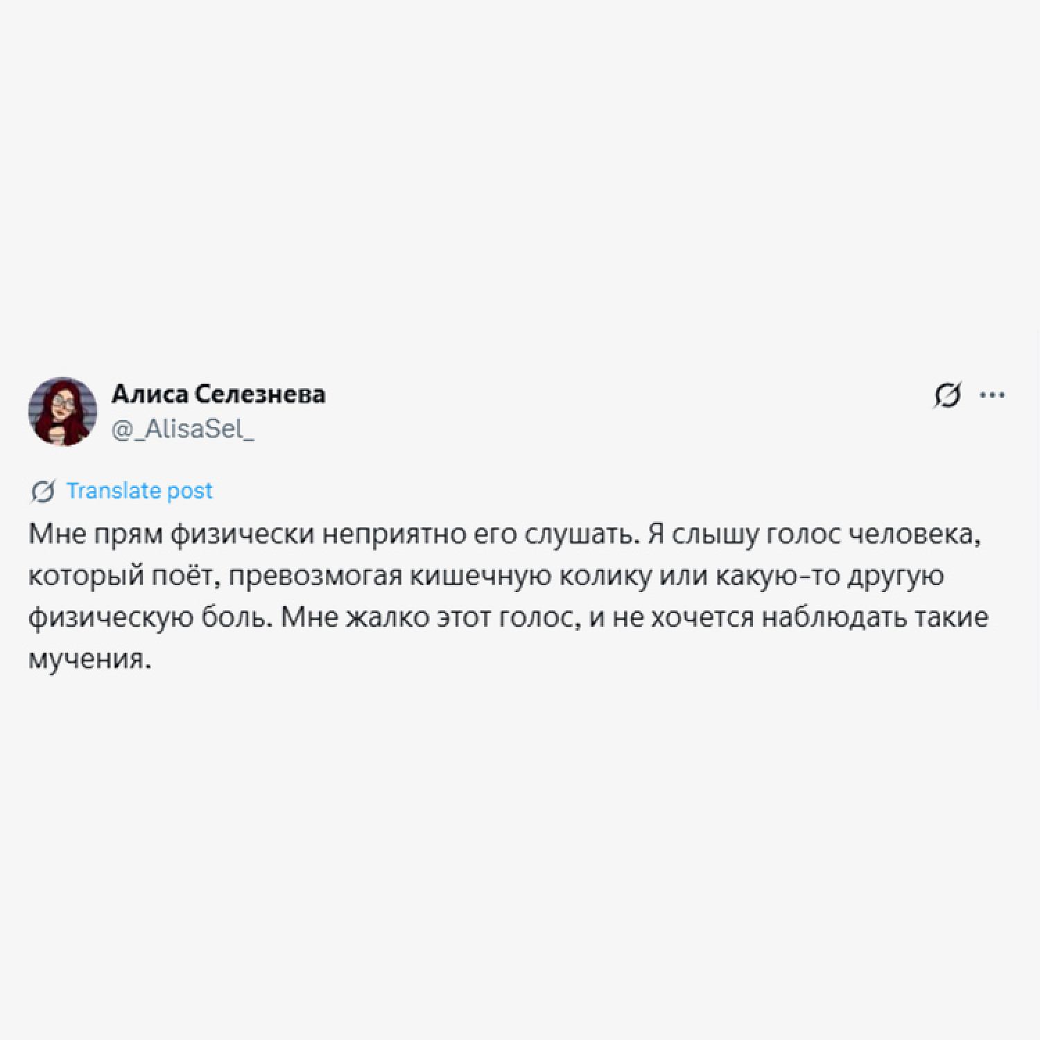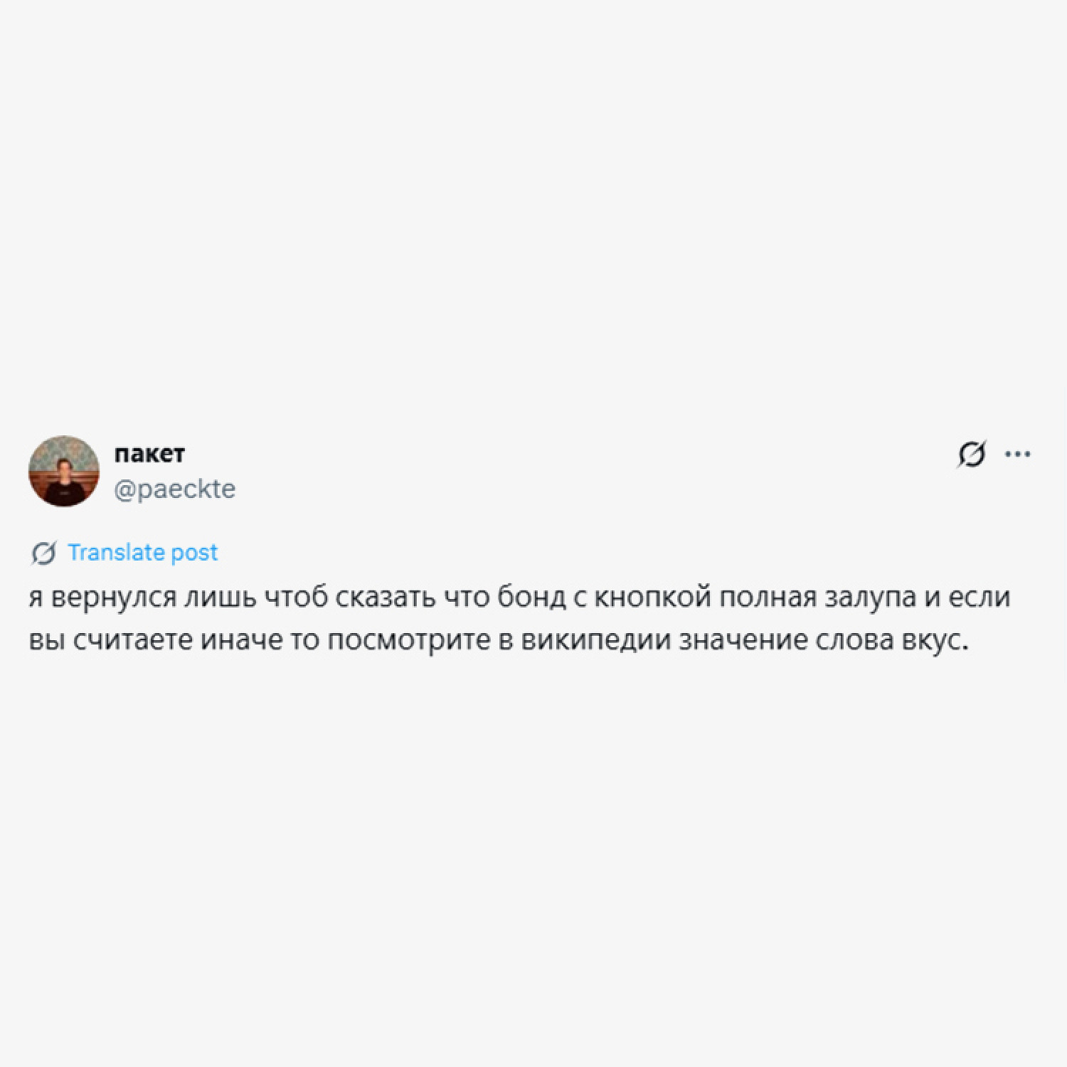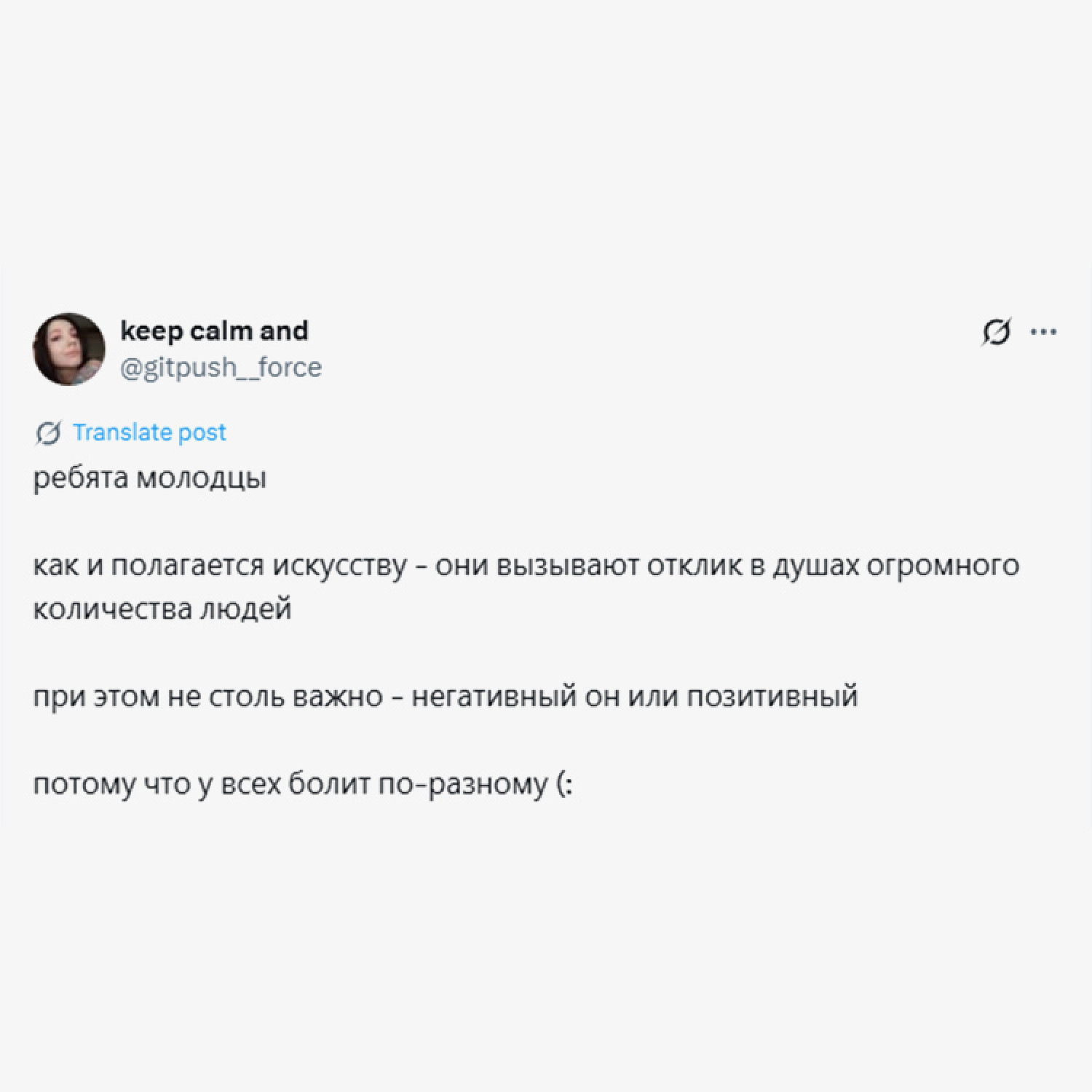 Большинство твиттерских не согласились с таким подходом к оценке лирики. Они подчеркивали, что слушают «Бонд» ради мелодии, вокала и вайба, а не текста. Кого‑то позабавило, что все резко «начали шарить за качественную поэзию». Мнение Распопова активно оспаривали: хрущевки вполне могут быть бережными, если лирический герой ассоциирует их с уютом и светлыми временами, а строчка «свобода цвета кителя Сталина» — это намеренный оксюморонСредство художественной выразительности, при котором сочетаются слова, противоречащие друг другу, например словосочетания «живой труп» и «оглушительная тишина». , суть которого не в фактическом оттенке, а в образном противоречии, передающем ощущение несвободы.