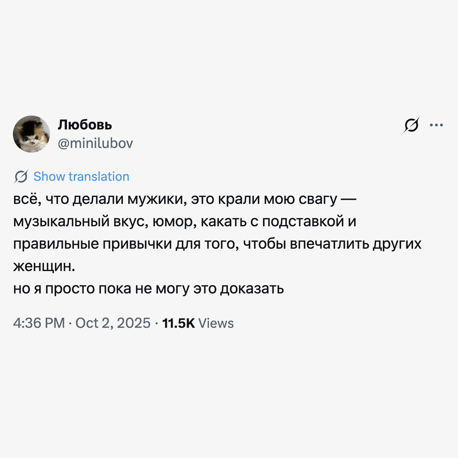 Мем-фраза этого месяца — «знаю, но не могу доказать». Ее используют в случаях, когда чувствуют явную связь между некими событиями, но не могут привести убедительных аргументов. «Я знаю, что все знакомые, которые не лайкают мои видео, чувствуют или зависть, или сильную неприязнь, но никак не могу доказать это», — утверждает @nnnn_bell. Еще, например, можно быть уверенными, что каждый мужчина в мире мяукает, когда остается один на один со своей девушкой, или что партнер специально не смеется над шутками, потому что завидует чувству юмора.