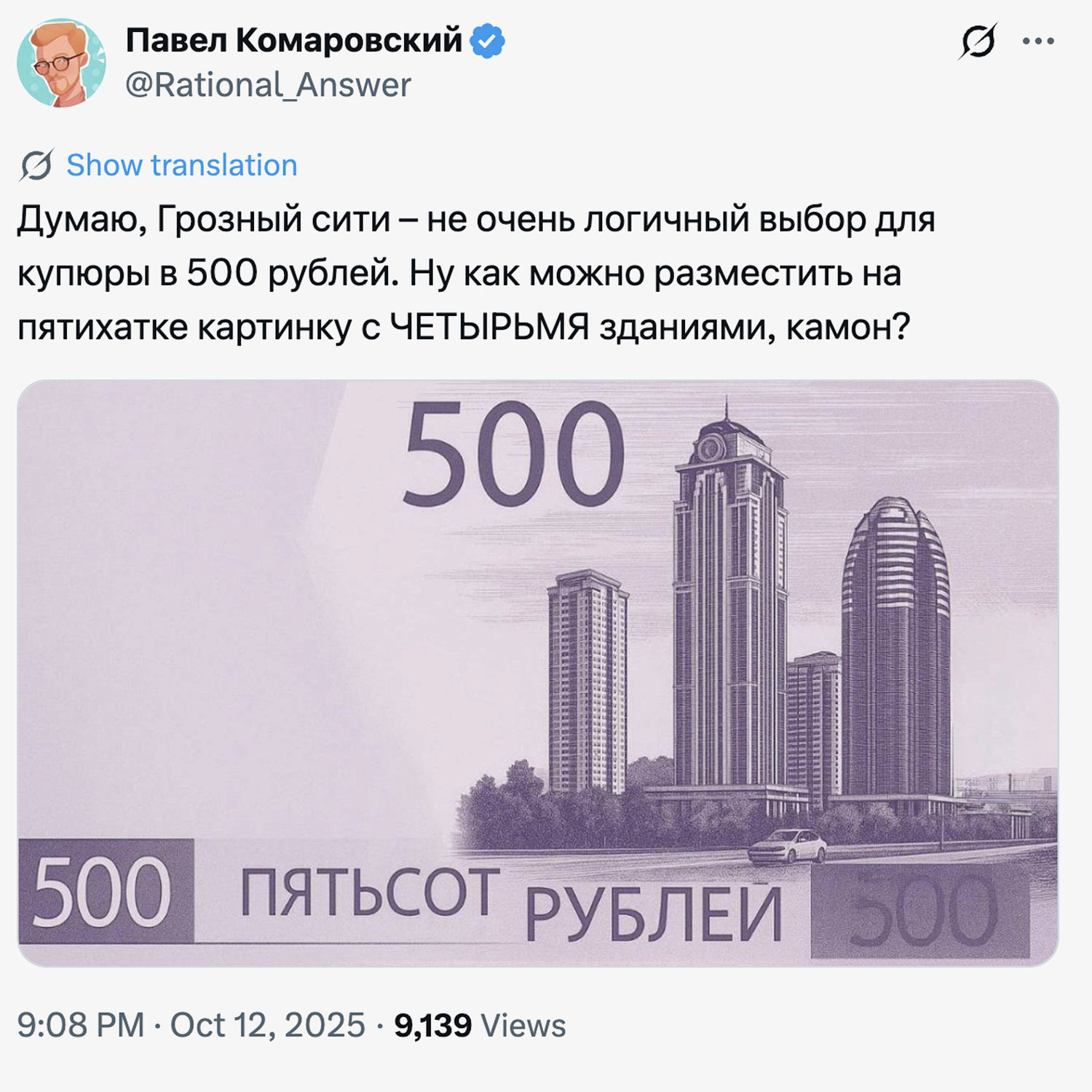 Жителям России предложили самостоятельно выбрать символику, 1 октября Центробанк запустил двухнедельное голосование. Но что-то пошло не так: между финалистами — высотным комплексом Грозный-Сити и Эльбрусом — разгорелась ожесточенная борьба. В дело вмешался Рамзан Кадыров, пообещавший разыграть 10 iPhone 17 для поддержавших Чечню. Позднее вице-спикер Госдумы Владислав Даванков решил отблагодарить тех, кто будет голосовать за Эльбрус, — призовым фондом стали 100 футболок «Высшая точка Кавказа», мерч партии «Новые люди» и поездка для двоих в санаторий горнолыжного курорта.