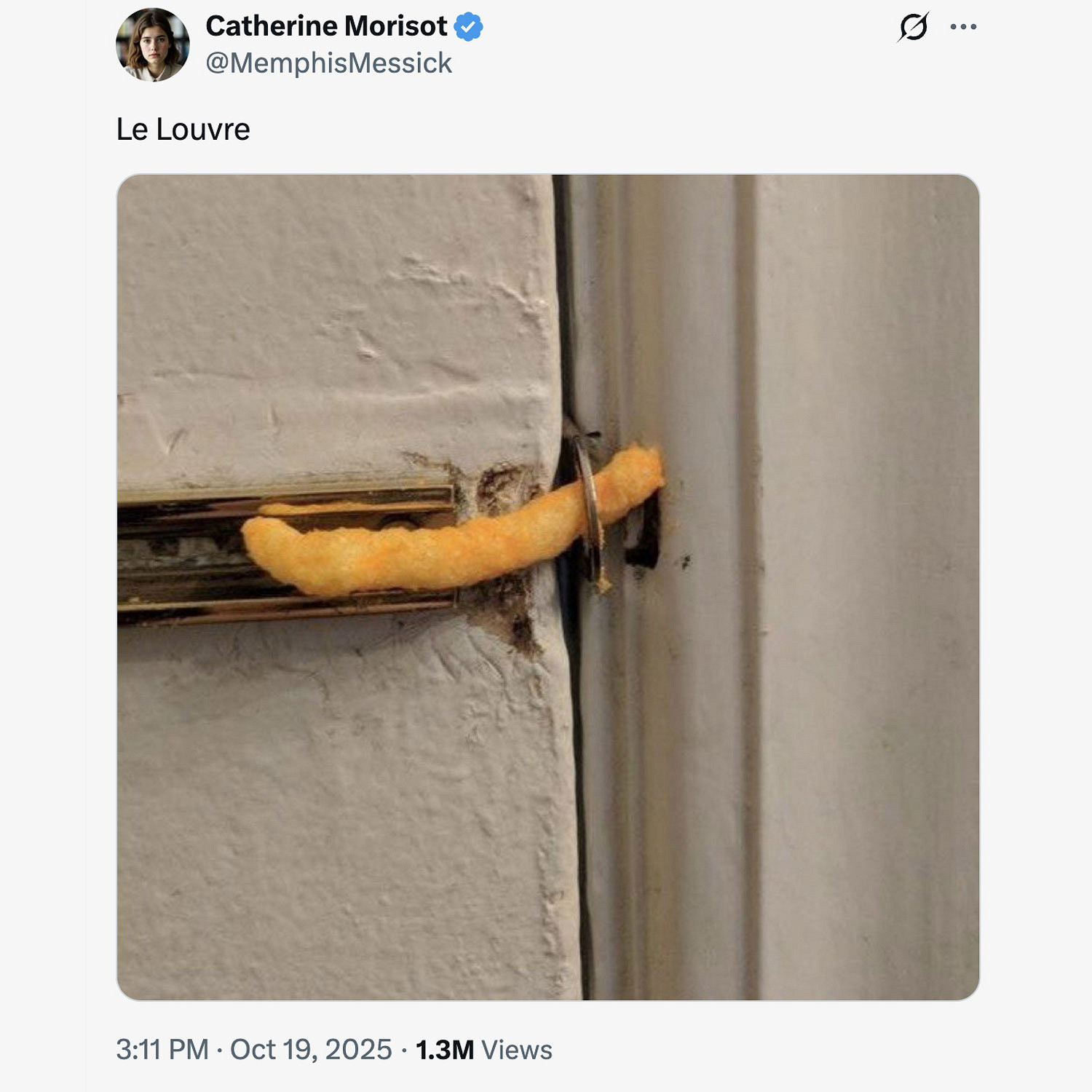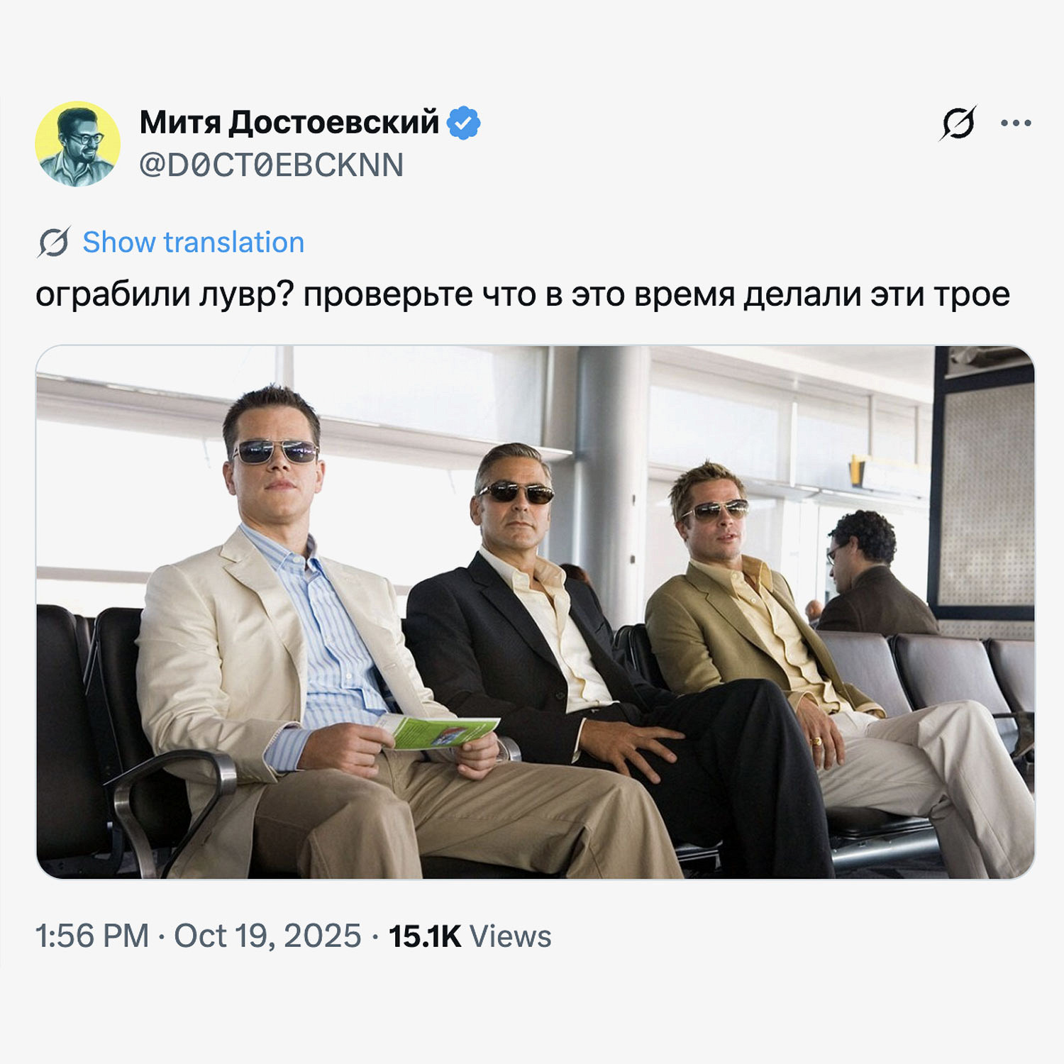 19 октября из парижского Лувра похитили девять предметов из коллекции драгоценностей Наполеона. На это у грабителей ушло всего семь минут: они поднялись по строительной лестнице и оказались в галерее Аполлона, где разбили стекло и забрали экспонаты. Французская полиция задержала уже семь подозреваемых в ограблении, но, где находятся пропавшие исторические украшения, неизвестно. Ущерб музея оценивается в 88 млн евро. Тем не менее в соцсетях нашли поводы для шуток.