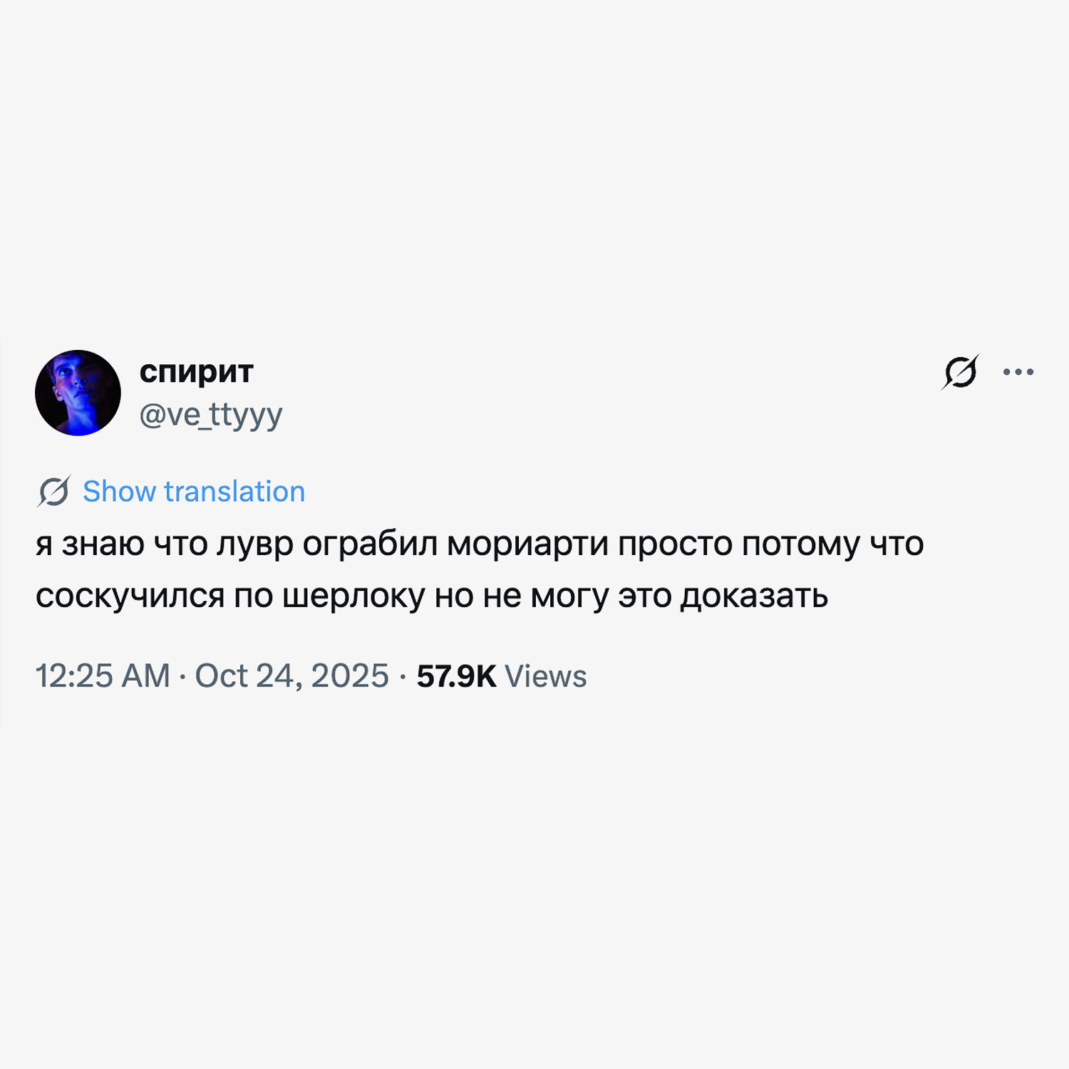 Например, начинают подозревать рэпера Navai — бойфренда фитнес-блогера Насти Мироновой. Девушка недавно рассказывала, как начался их роман, и упомянула, что на одном из первых свиданий мужчина попытался отковырнуть краску на картине в Третьяковской галерее, а потом поинтересовался, можно ли там что-то купить. А знатоки вселенной Шерлока Холмса чувствуют, что в деле замешан Мориарти, ведь ему уже удавалось ограбить королевскую сокровищницу в Тауэре, чтобы эффектно привлечь внимание детектива.