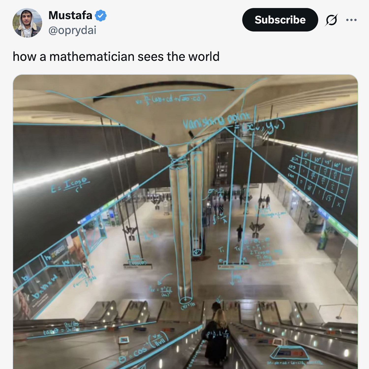 Пользователь твиттера @oprydai 18 октября опубликовал расчерченную и расписанную формулами фотографию эскалатора и холла. «Как математики видят мир» — подписал ее мужчина, который сам, судя по био профиля, работает инженером. Комментаторы иронизируют, что таблица тригонометрических функций оказалась просто нарисована на стене, потому что для нее не нашлось никакого реального применения.