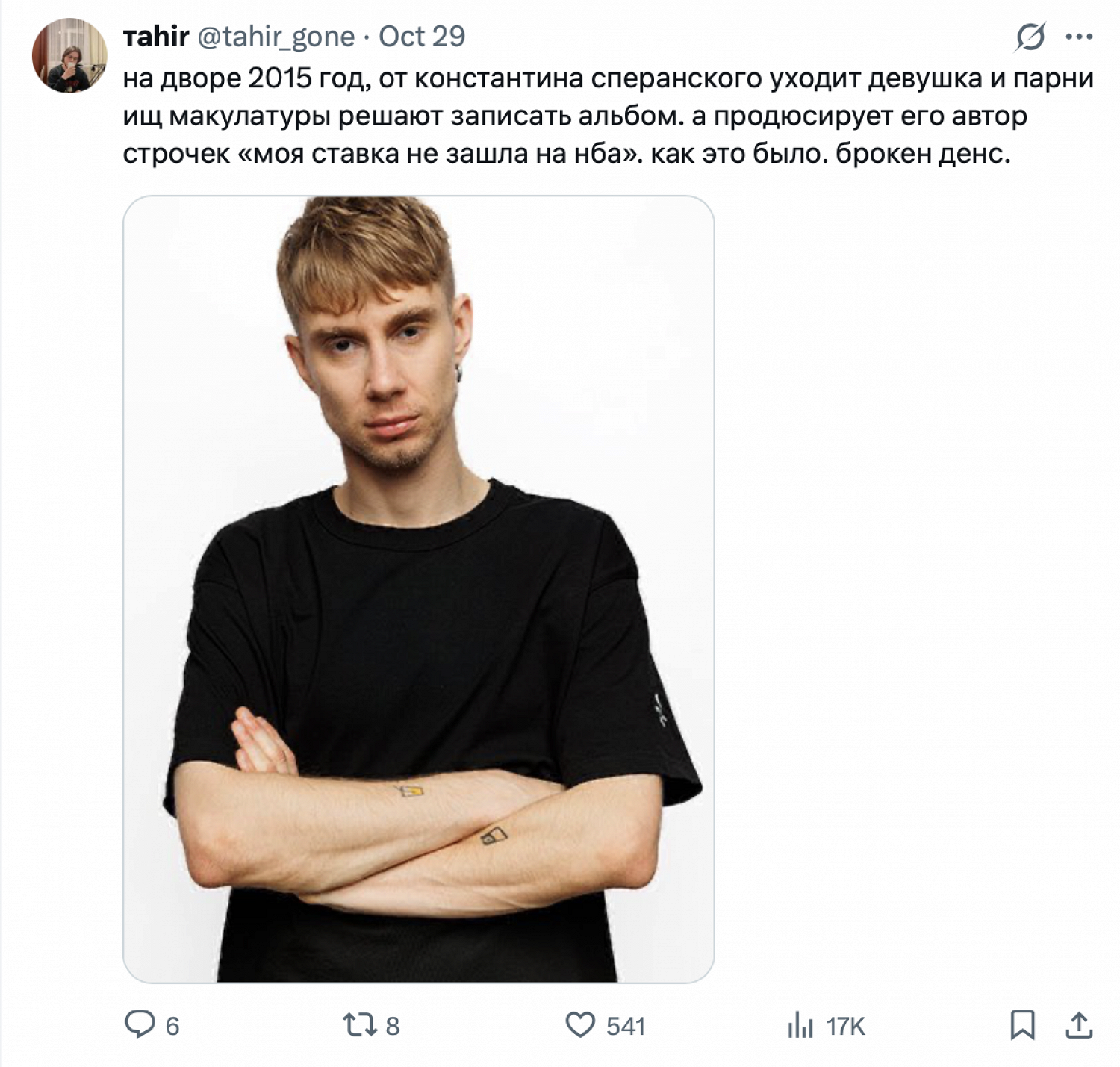 «Это не шутка, если что, мы с Васей правда были в „Антихайпе“. Нас принимали Замай и Гнойный и проводили инициацию с помощью палки колбасы (я не сошел с ума, смотрите видео ниже). Потом почему-то нас единомоментно исключили, Гнойный объяснял это тем, что „документики какие-то затерялись“ (пруф, видео с таймкодом). Так что я бы хотел со страниц „Афиши Daily“ обратиться к теперешней администрации „Антихайпа“: верните нас обратно, иначе мы сделаем свой „Антихайп“!»