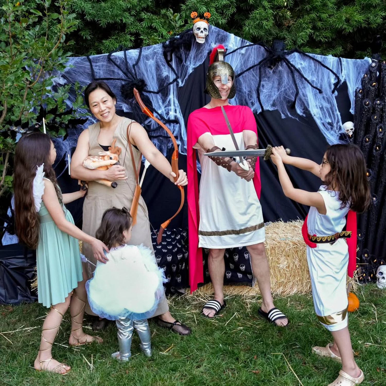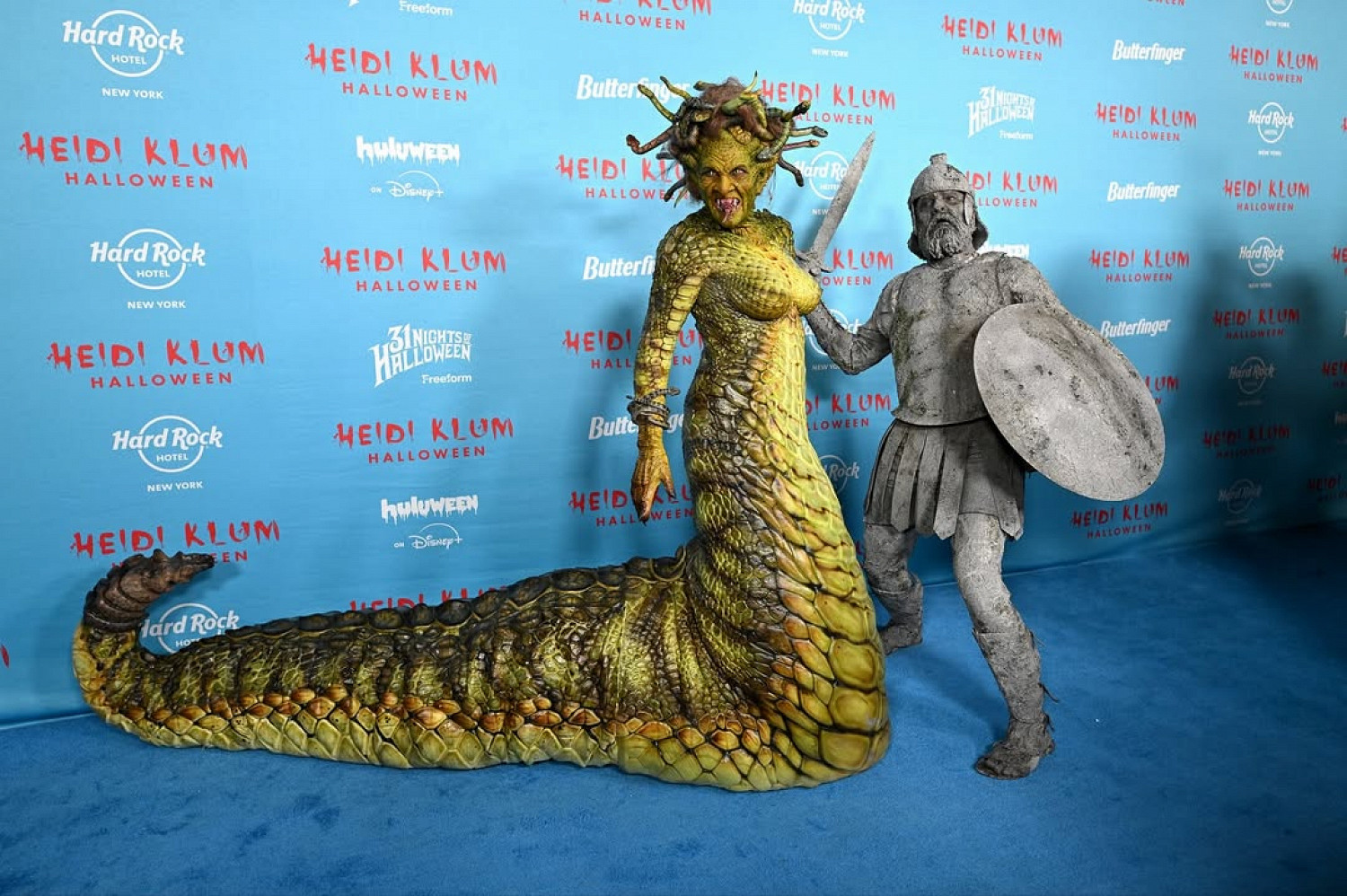 Королева Хэллоуина снова всех удивила. В этом году она пришла на свою ежегодную вечеринку в образе Медузы-горгоны с раздвоенным языком и движущимися змеями на голове. Ее муж появился в образе рыцаря, превратившегося в камень от ее взгляда.