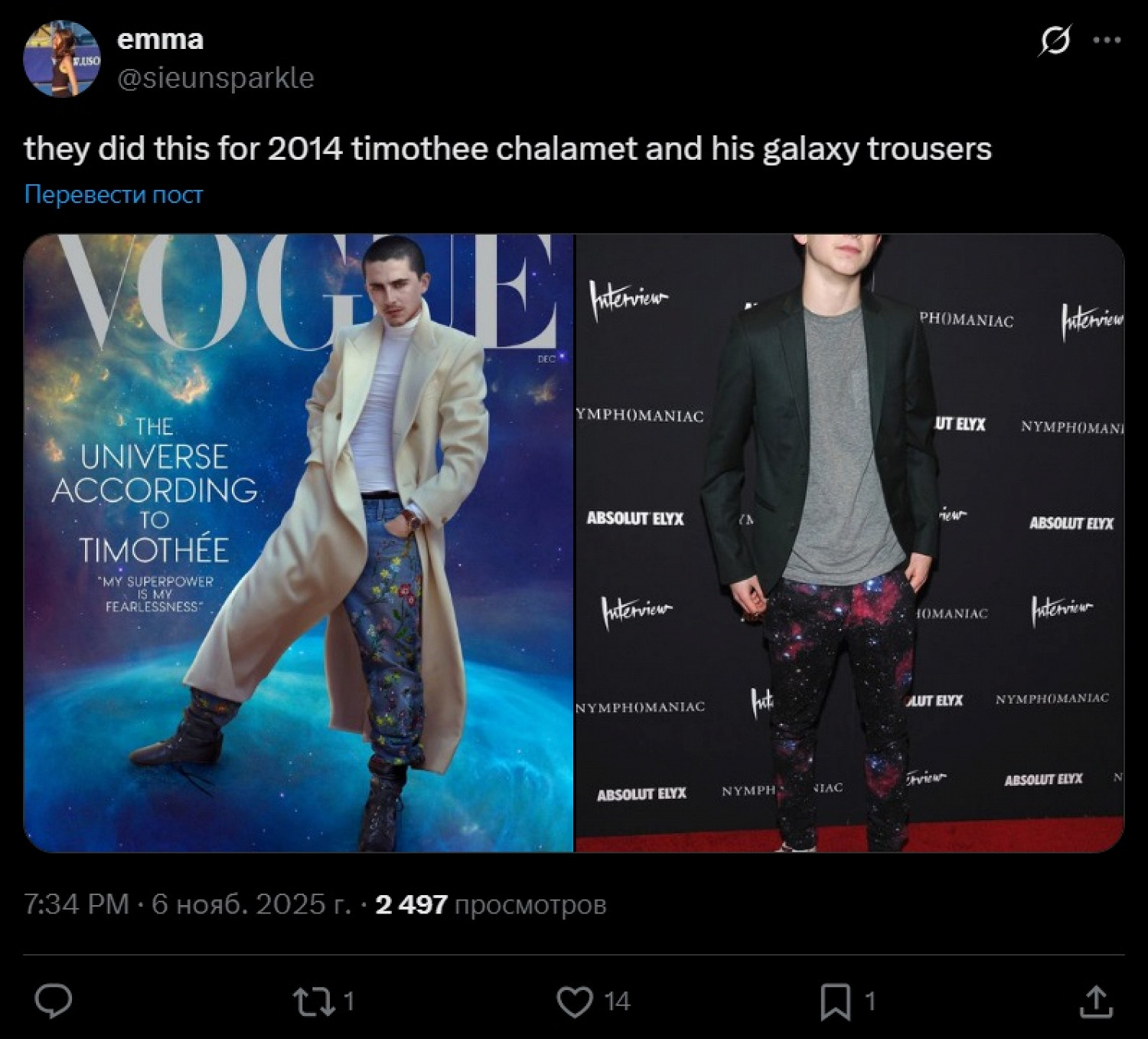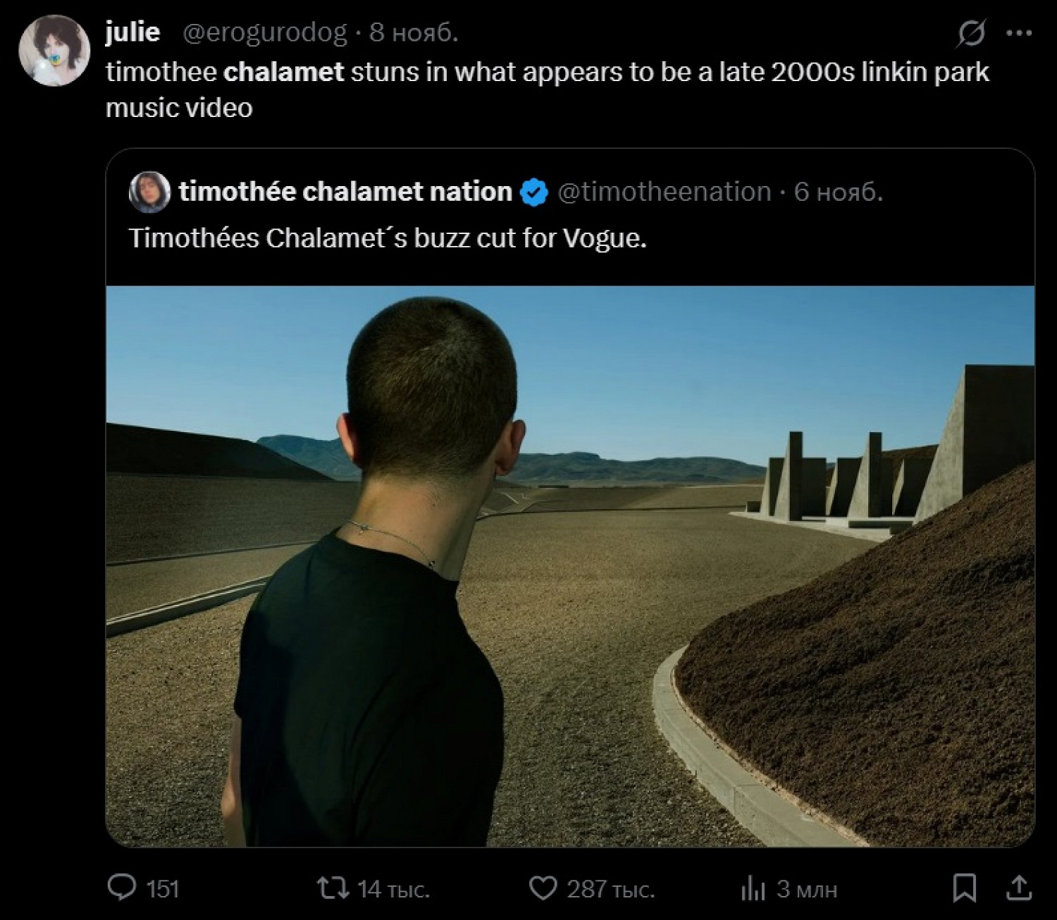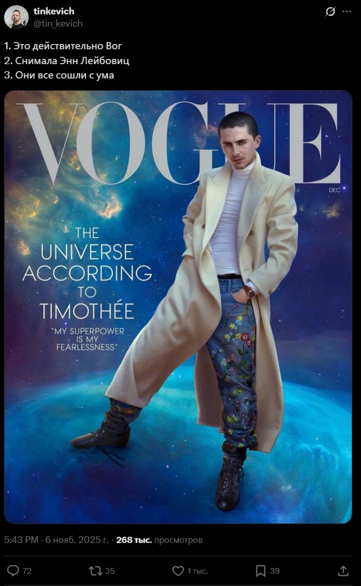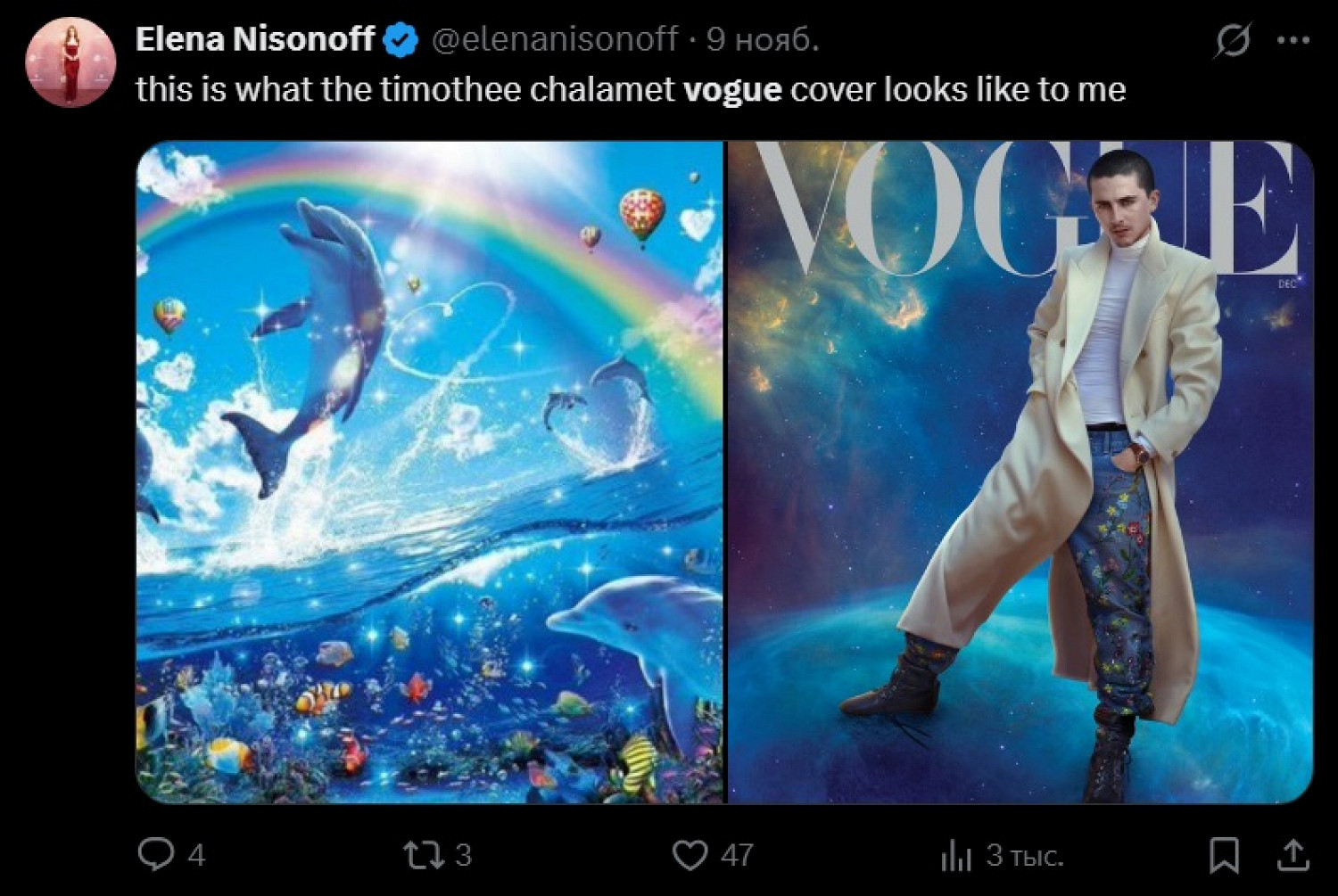 Даже если это окажется не так, Vogue уже подарил пользователям соцсетей отличный повод посмеяться. TikTok, X, Threads*, Instagram* и Reddit заполонили мемы. В одних люди критиковали съемку с Шаламе, в других — пытались (с трудом) ее похвалить.