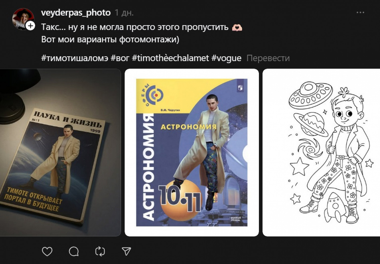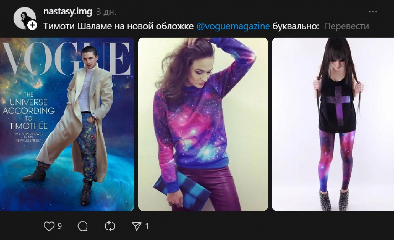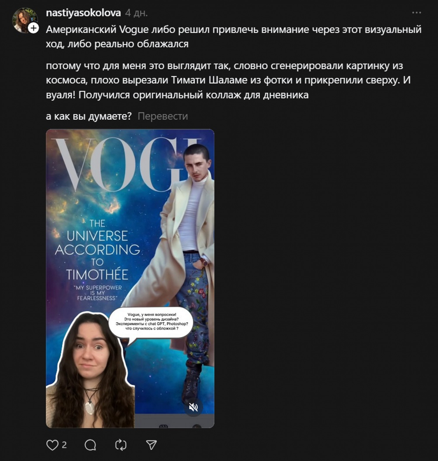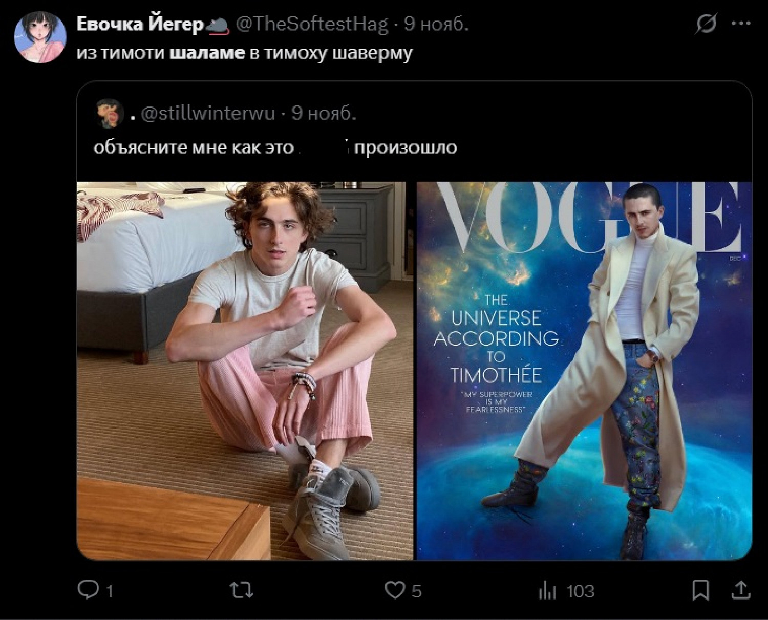 Даже если это окажется не так, Vogue уже подарил пользователям соцсетей отличный повод посмеяться. TikTok, X, Threads*, Instagram* и Reddit заполонили мемы. В одних люди критиковали съемку с Шаламе, в других — пытались (с трудом) ее похвалить.