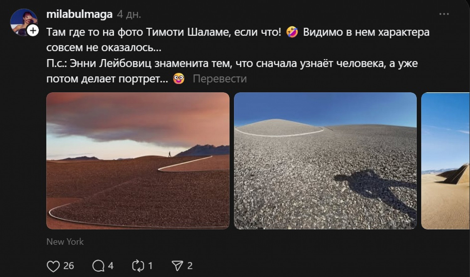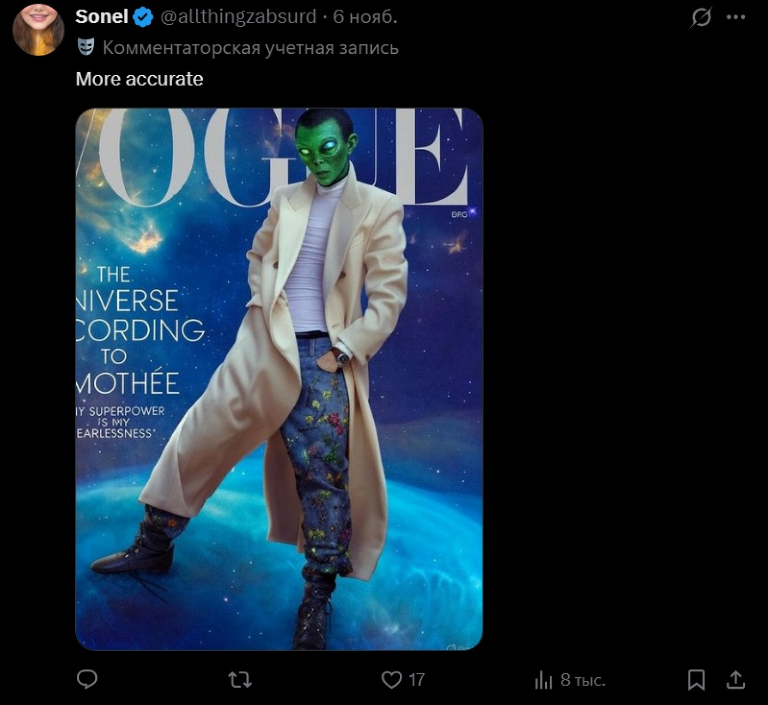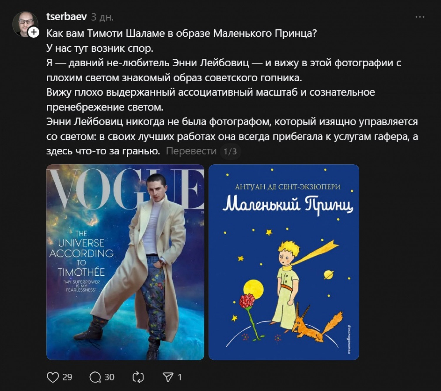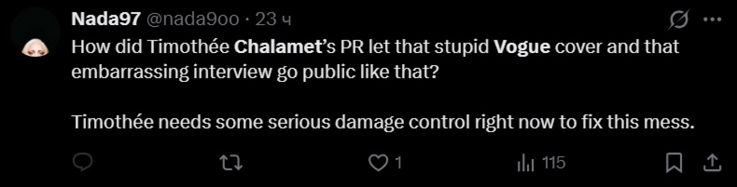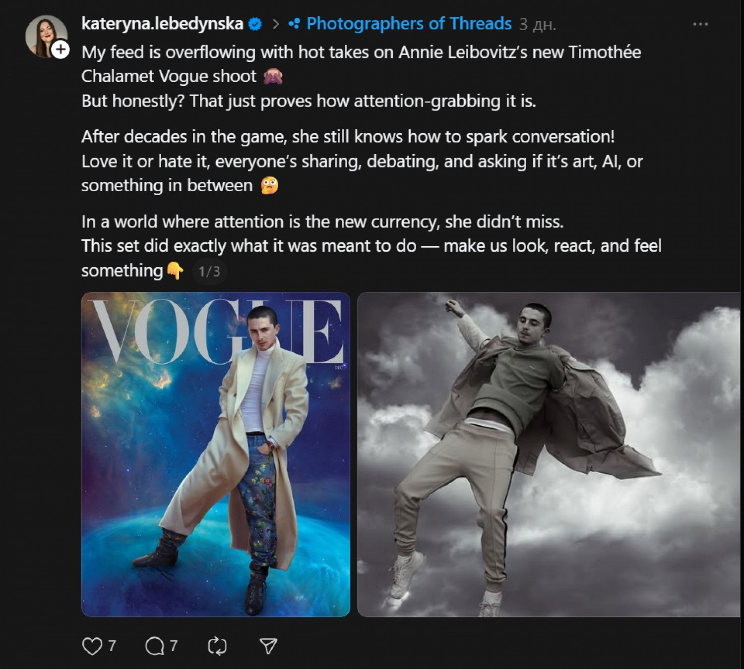 Даже если это окажется не так, Vogue уже подарил пользователям соцсетей отличный повод посмеяться. TikTok, X, Threads*, Instagram* и Reddit заполонили мемы. В одних люди критиковали съемку с Шаламе, в других — пытались (с трудом) ее похвалить.