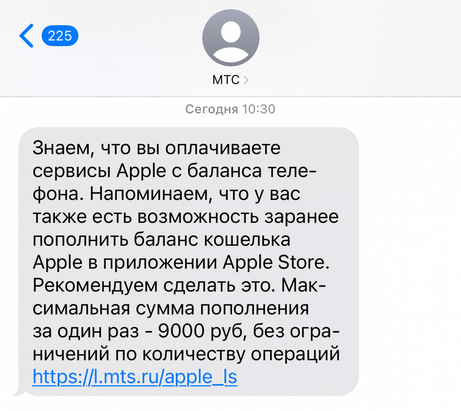 31 марта оператор разослал абонентам СМС с рекомендацией пополнить баланс кошелька Apple — с уточнением, что за один раз на счет можно положить 9000 рублей, при этом количество операций не ограничивается.