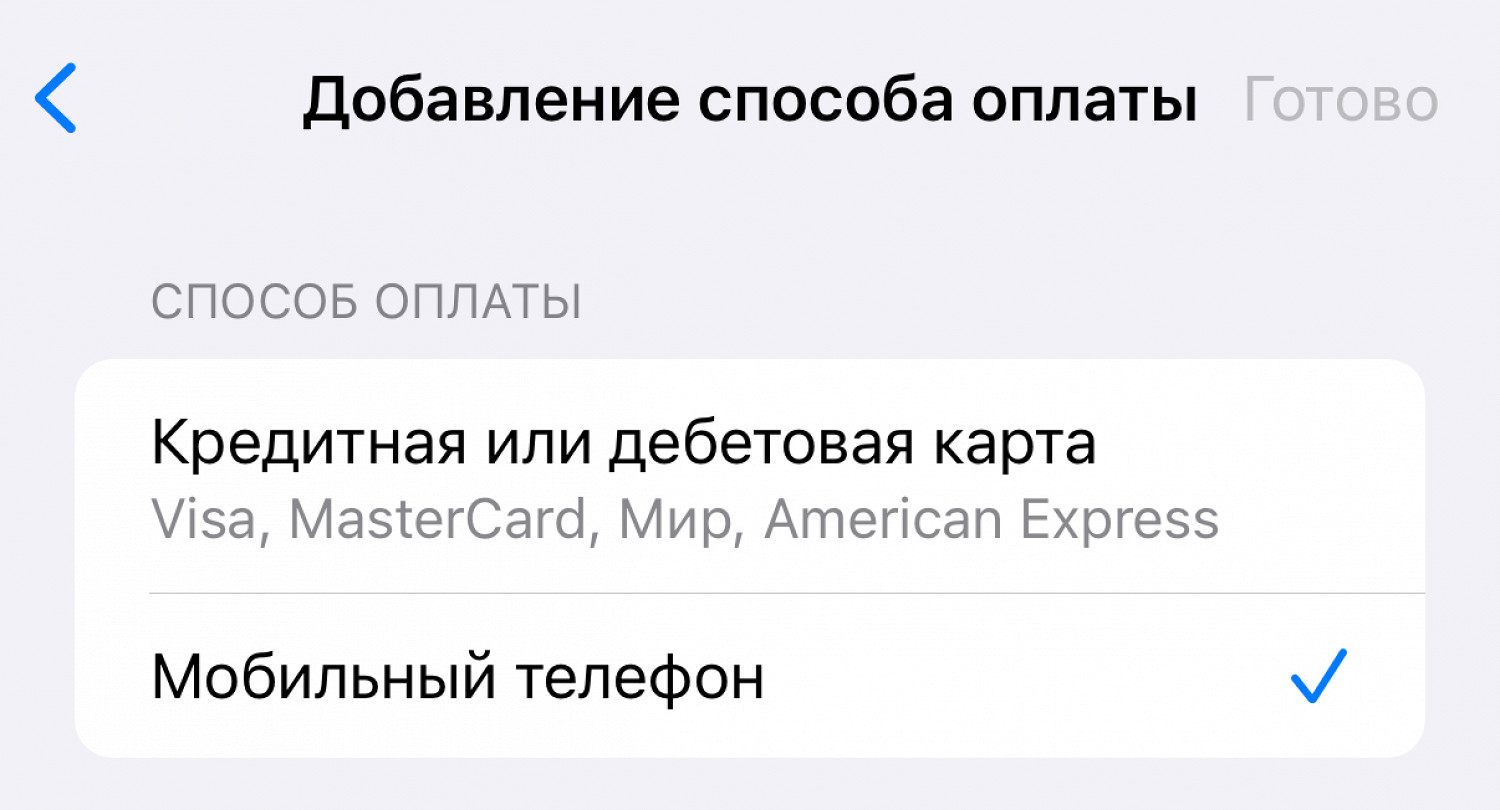 Инструкция аналогичная: чтобы оплачивать подписки в App Store с баланса телефона, абонентам «Билайна» нужно настроить способ оплаты в настройках айфона. Для этого в учетной записи Apple нужно выбрать пункт «Мобильный телефон» вместо «Кредитная или дебетовая карта», а потом ввести код из СМС для подтверждения привязки номера.