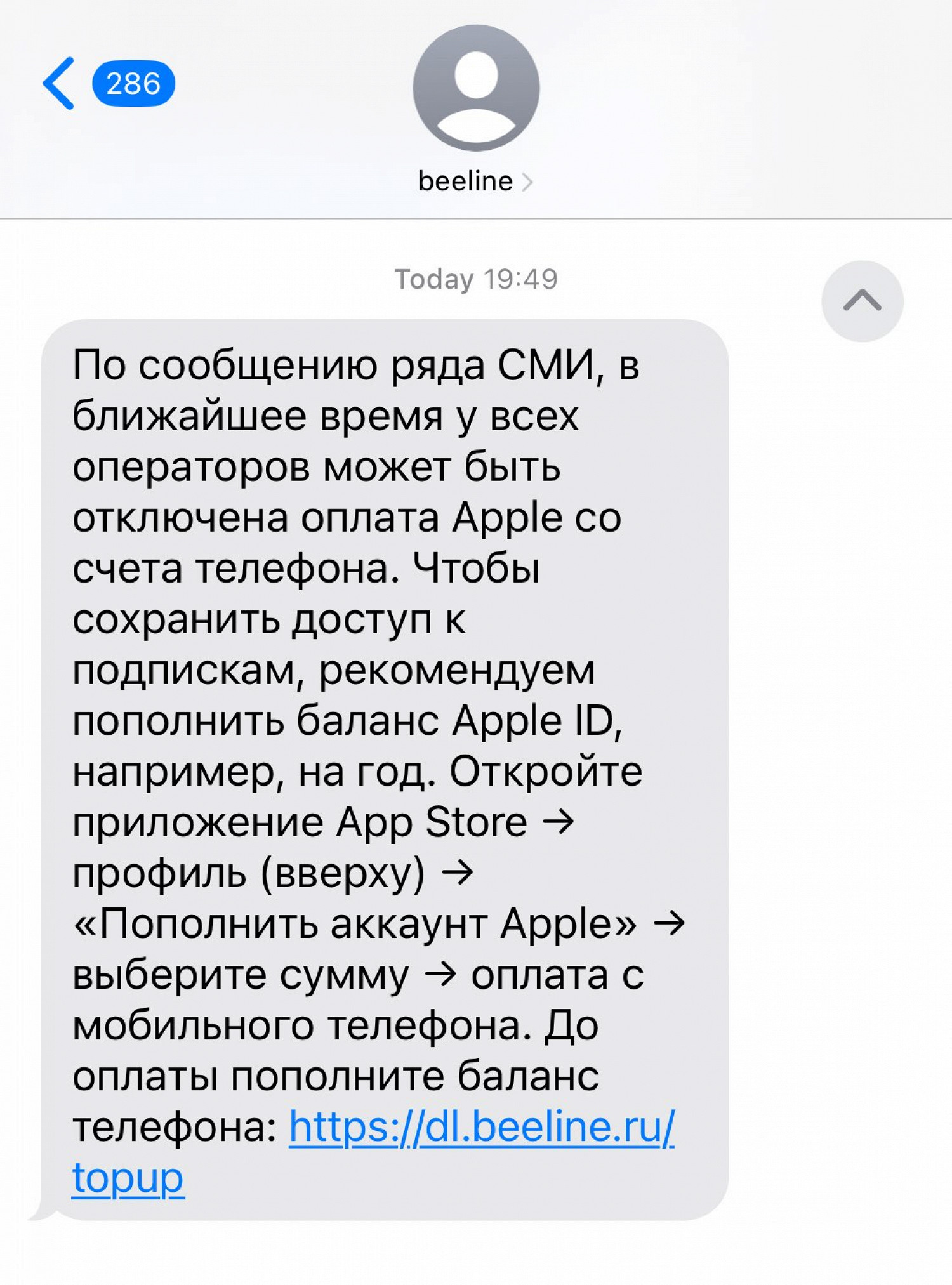 Вечером 30 марта оператор тоже разослал абонентам СМС с рекомендацией пополнить баланс Apple ID — например, на год.