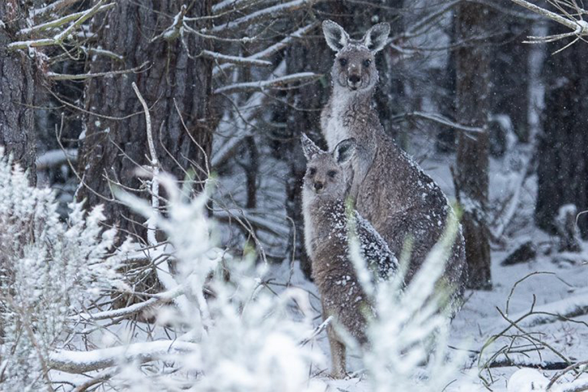 На юге Австралии впервые за 35 лет выпал снег. Кенгуру этому очень рады!