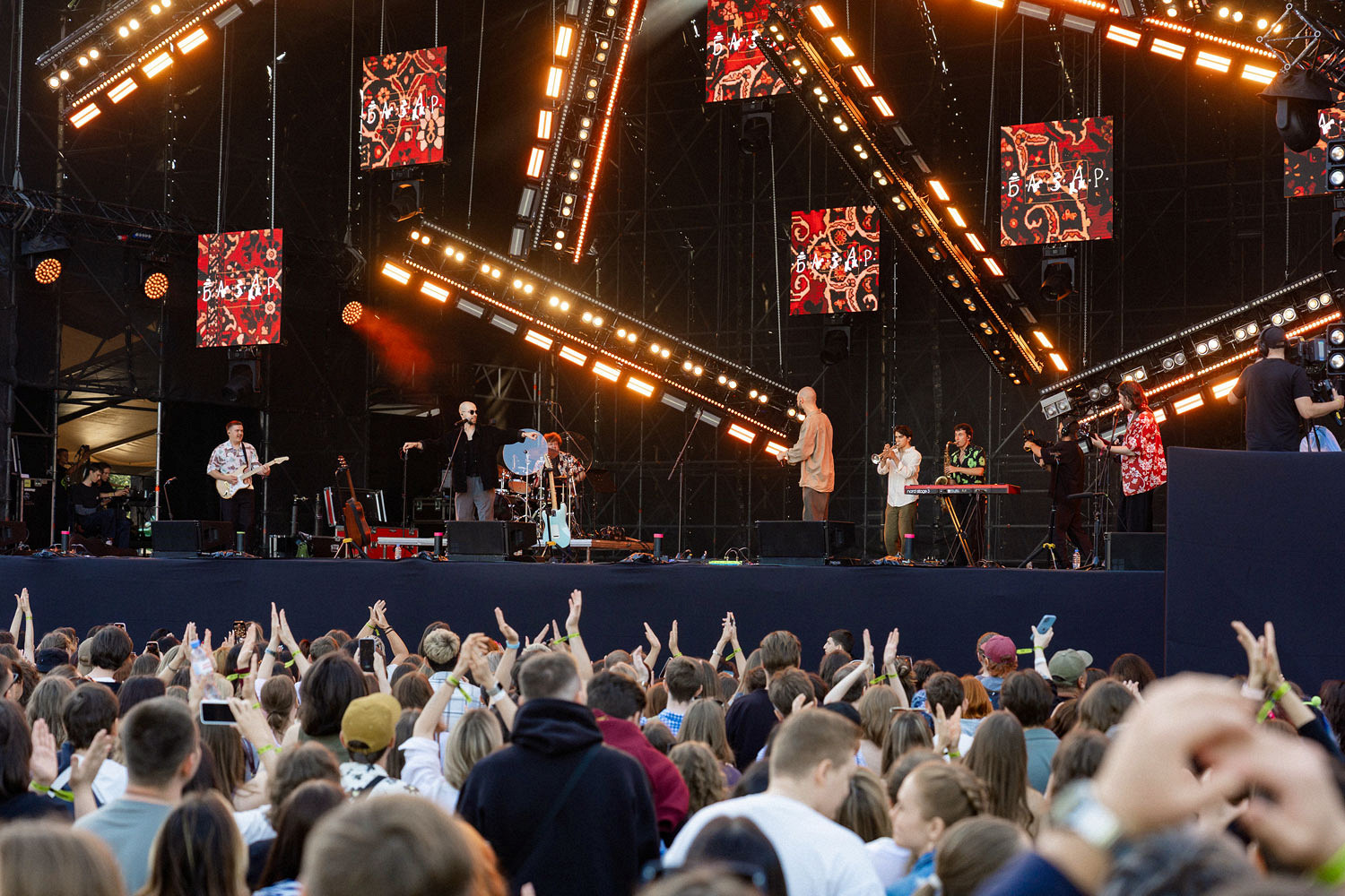 Но главное — это все же музыка, поэтому, захватив дождевик, я побежал на сет группы «Базар». Мне нравится, как герои, с которыми я общался еще на заре их карьеры, вырастают в больших артистов с солидными сетами на главной сцене. Живьем «Базар» еще лучше, чем на записях: их блюзовая и рокерская персоналити как‑то особенно живо и ярко раскрываются, тем более что Дима Милаев и Митя Неустроев выступали с бендом.
