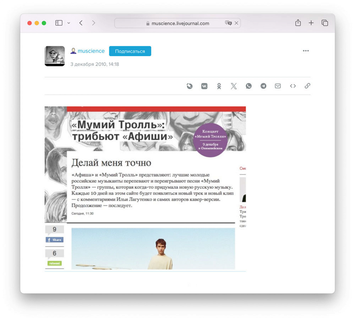 Выходили и конкретно музыкальные издания. В разное время это были Rolling Stone, Play, Fuzz, Billboard — кого-то я явно забыл. Это все были классические печатные издания. ЖЖ, мне кажется, стал первой популярной площадкой для блогов о музыке. Я читал там Горбачева, Биргера, Олега Соболева. Но это все равно были блоги людей, которые профессионально пишут для медиа, а в ЖЖ как-то дополнительно самореализуются. Монетизации не было, так что буквы в ЖЖ были чем-то вроде хобби.