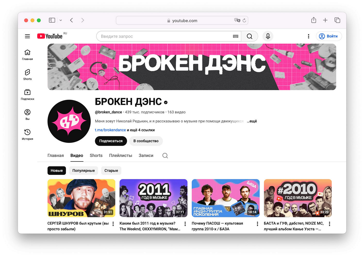 Вот Коля Редькин и его проект «Брокен дэнс» (а заодно и телеграм-канал «Сломанные пляски»). Коля уже много лет не занимается музыкальной критикой, а рассказывает о сложившихся феноменах хоть в долгих ютуб-роликах, хоть в рилсах. А еще помогает проще идентифицировать музыку. В этом году с его подачи в нашем лексиконе осело выражение «новые добрые», описывающее музыку Сироткина, «Совы», Рушаны и целого ряда артистов.