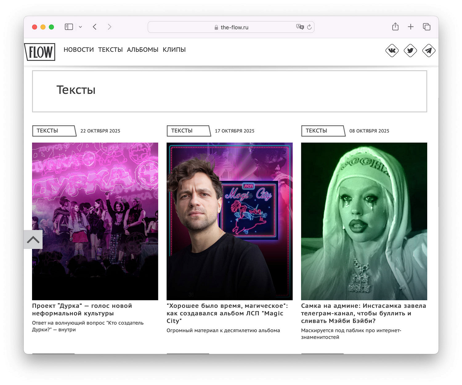 Классические медиа никуда не делись, просто новых уже не появится. Это все еще музыкальный раздел «Афиши Daily», сайт The Flow и рассказы о музыке у других медиа — The Blueprint, Forbes Young и не только. Они продолжают успешно существовать, у них уже есть сложившаяся аудитория. Довольно показательно, что в поп-культурной среде не появилось ни одного долгоиграющего успешного сайта после 2014 года. Сейчас делать такой проект кажется бессмысленным: ниша занята уже существующими медиа, да и зачем, когда намного проще вложиться во внятный телеграм-канал — среду, где новые проекты успешно запускаются до сих пор, а авторы создают микромедиа имени себя.