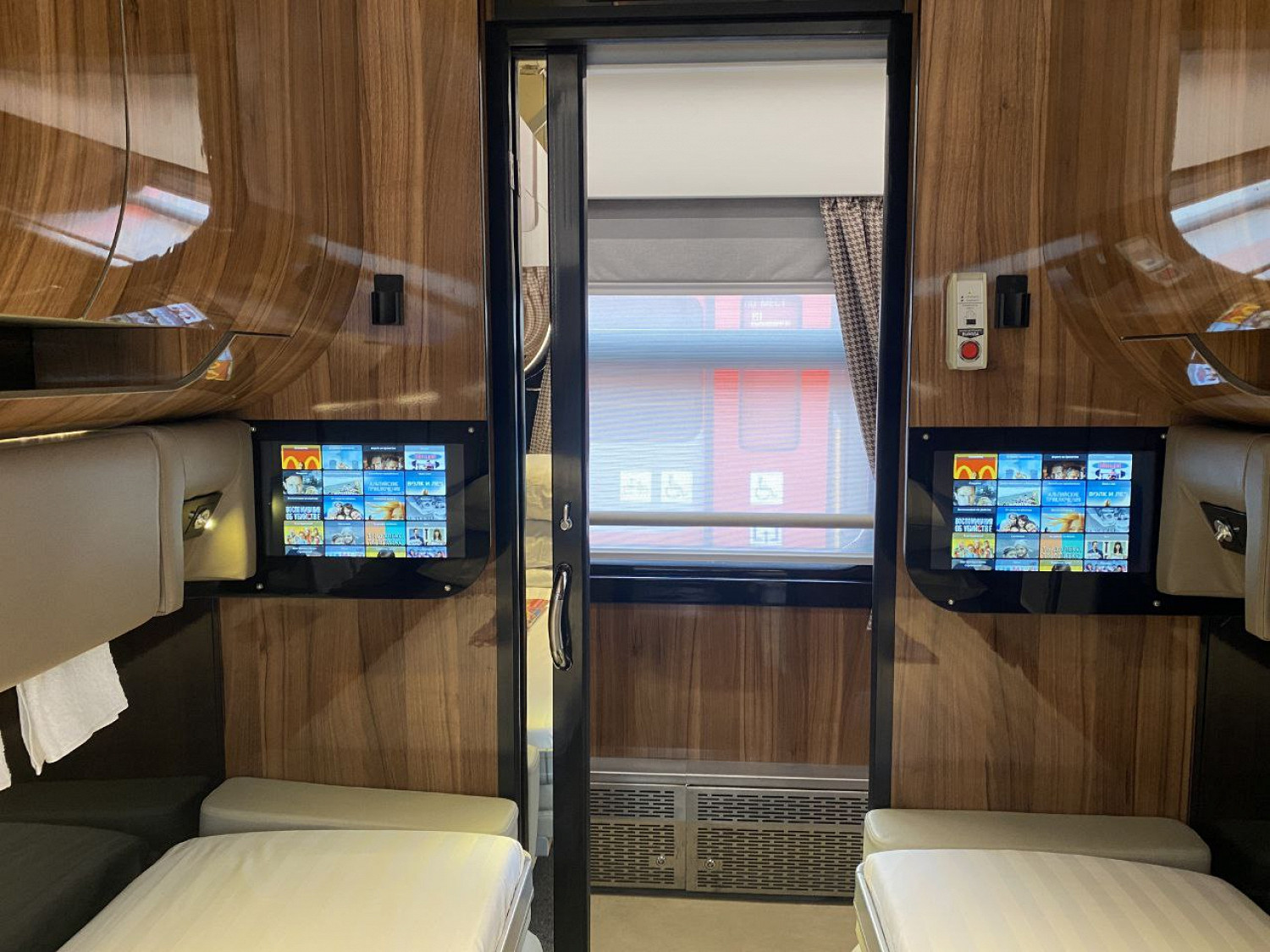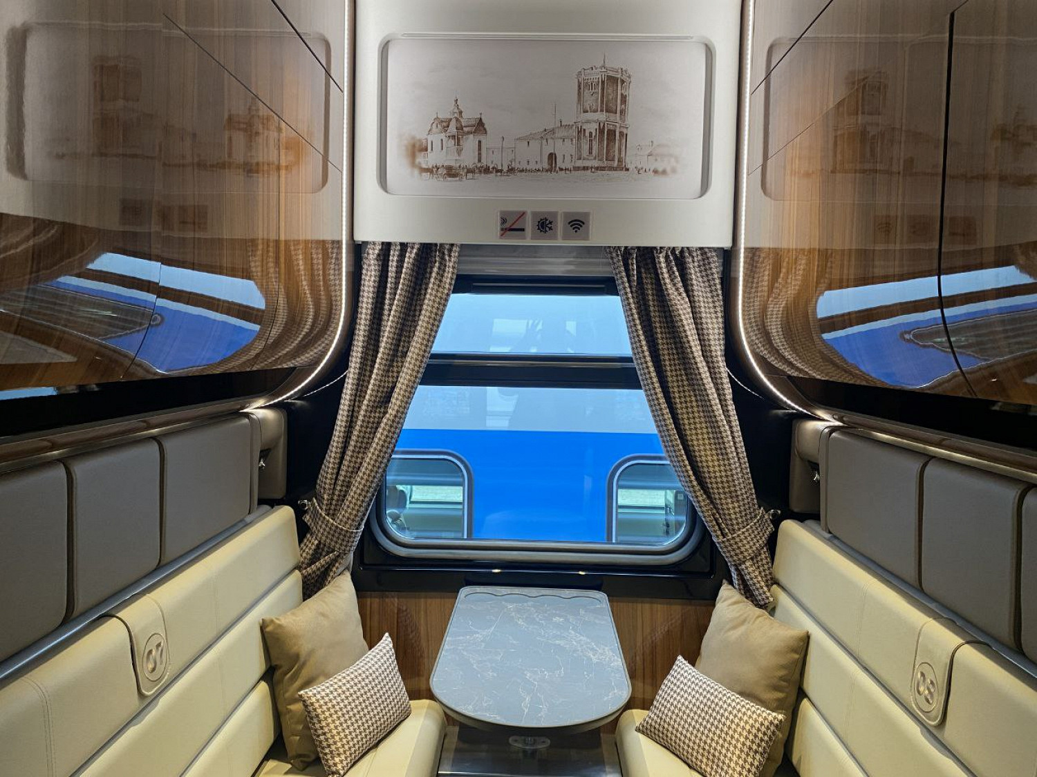 На столе расположились станции для беспроводной зарядки, а в ногах кровати — экраны, на которых можно будет посмотреть кино или ТВ. Температуру в купе получится регулировать индивидуально под себя. В каждом вагоне помимо санузлов оборудовали душевую с феном, утюгом и гладильной доской.