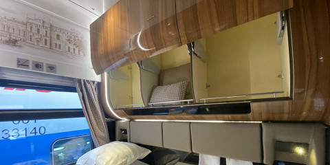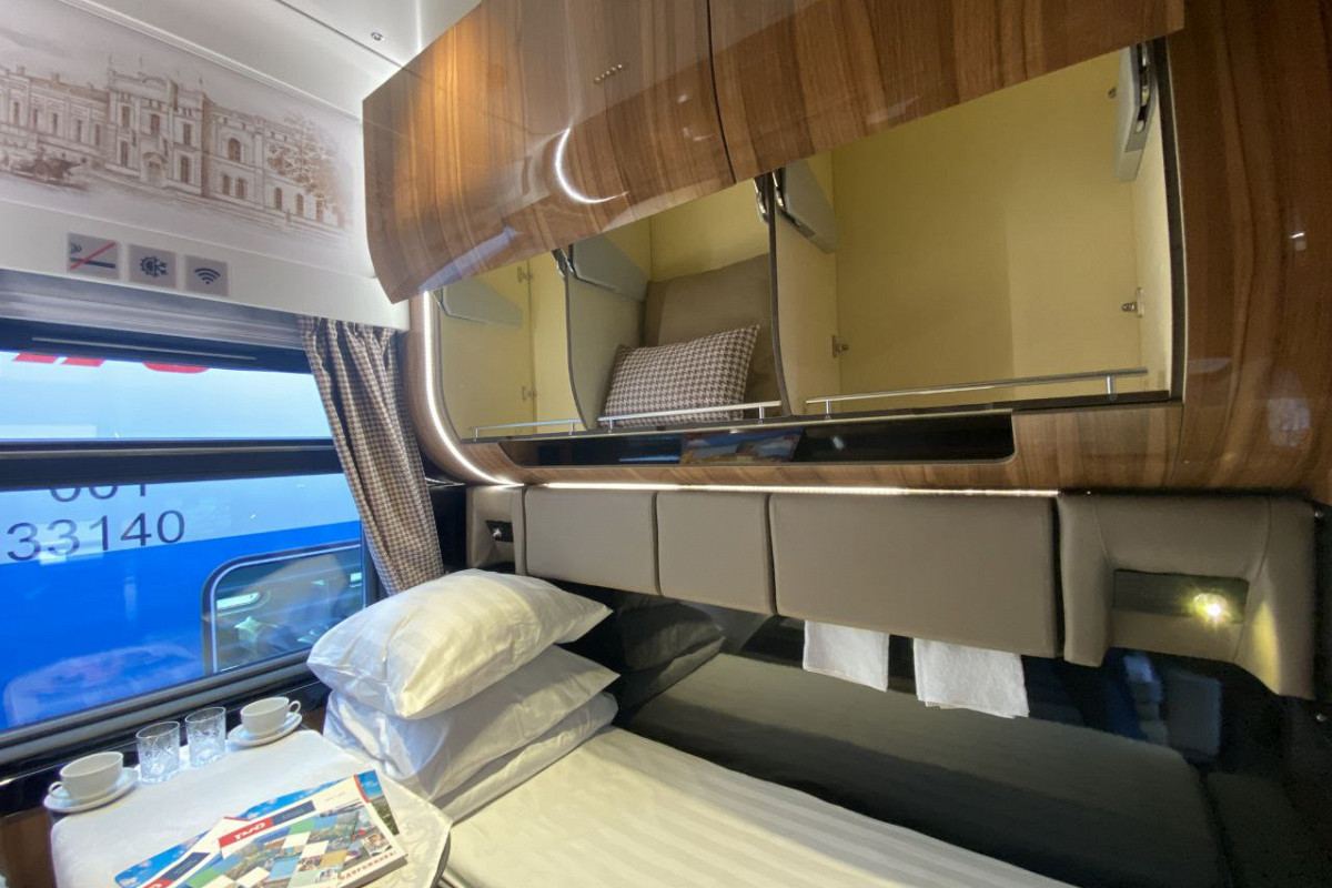 Теперь длина полки составляет ровно 2 метра. В купе стало больше места для вещей, закрытые полки над кроватями увеличили, чтобы вместить больше ручной клади и спортинвентаря. Для ценных вещей установили сейф.