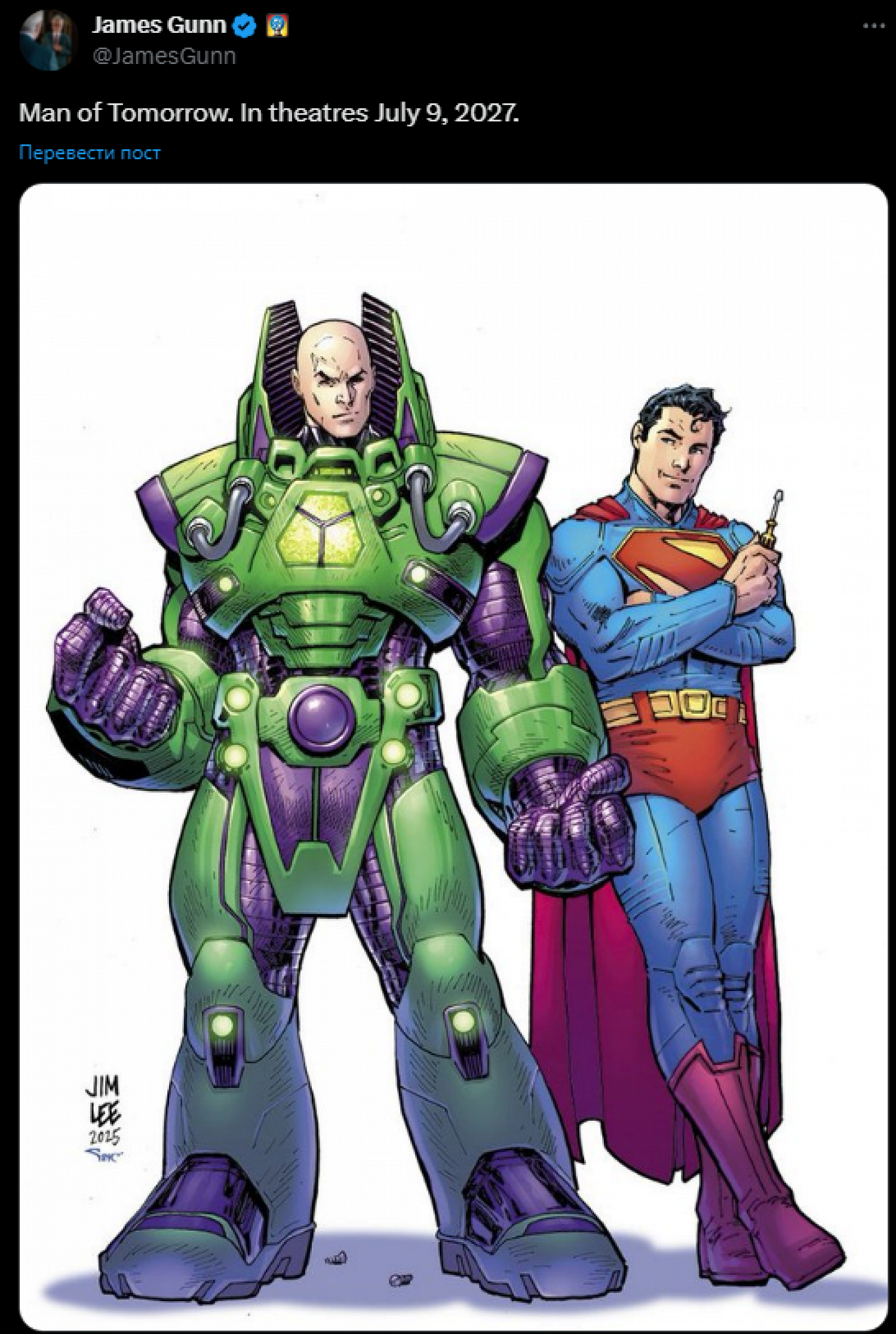 К посту он прикрепил изображение из комикса, где Супермен стоит рядом с Лексом Лютором в его боевом костюме. Это указывает на то, что сиквел продолжит развивать линию вражды Лютора с Человеком из стали.