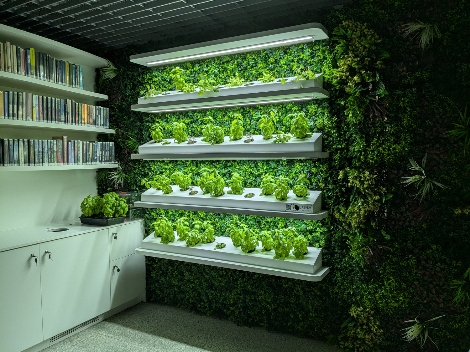 Библиотеку украшает вертикальный сад, в котором растут свежие травы ― базилик и орегано, а также цветы ― настурции и виолы. Гидропонная стена оборудована без естественного света и почвы.