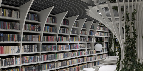 Библиотека предлагает две зоны для чтения — для взрослых и детей, а также площадку для публичных чтений и мероприятий. В общей зоне, оборудованной вайфаем и розетками, посетители могут учиться или работать.