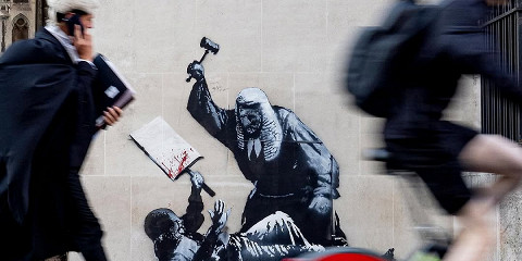 На граффити судья в мантии и парике молотком избивает лежащего на земле протестующего. Работа появилась спустя два дня после массовых задержаний на митинге против запрета организации Palestine Action.