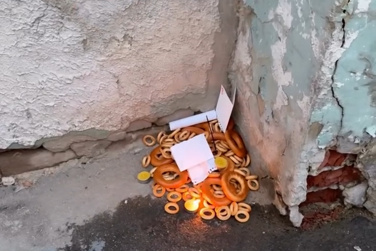 Одинокие девушки приносят к старой четырехэтажке на улице Советской сушки, которые, по слухам, в детстве любил Абрамович. К алтарю также кладут свечи и любовные записки.