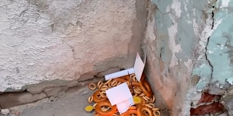 Одинокие девушки приносят к старой четырехэтажке на улице Советской сушки, которые, по слухам, в детстве любил Абрамович. К алтарю также кладут свечи и любовные записки.