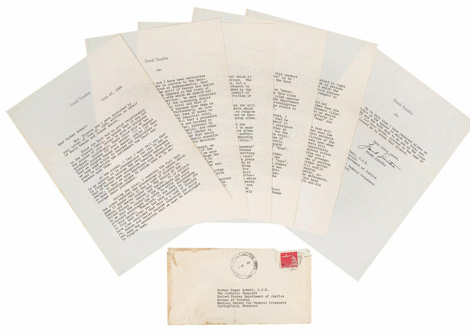 В нем певец рассуждает о похищении своего сына, 19-летнего Фрэнка-младшего, в 1963 году. Организаторы оценивают лот в сумму до 30 тыс. долларов. Письмо, состоящее из шести страниц, было адресовано тюремному священнику Роджеру Шмиту.