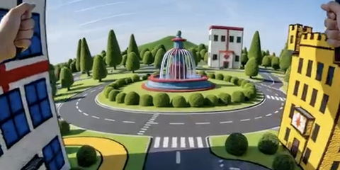 Самолет из ковролина стоит у аэропорта, а машина заправляется на мягкой бензоколонке. Ролик смонтирован от первого лица: создается впечатление, что зритель приземляется на парашюте, а затем исследует город.