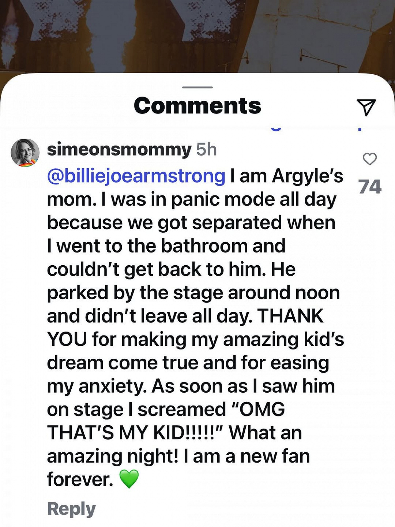 «Я мама Аргайла. Я весь день паниковала, потому что мы разминулись, когда я отошла в туалет и не смогла вернуться к нему. Он занял место у сцены около полудня и не уходил весь день. СПАСИБО, что осуществили мечту моего потрясающего ребенка и помогли успокоить мою тревогу. Как только я увидела его на сцене, я закричала: „БОЖЕ МОЙ, ДА ЭТО ЖЕ МОЙ МАЛЬЧИК!!!!!“ Какой удивительный вечер! Теперь я ваш фанат навсегда», — написала мама в комментариях к публикации Билли Джо Армстронга, фронтмена группы.