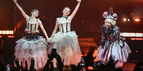 Гага, сыгравшая эпизодическую роль Розалин Ротвуд в «Уэнсдей», не танцевала под эту песню в сериале, но на сцене она присоединилась к двум актрисам.