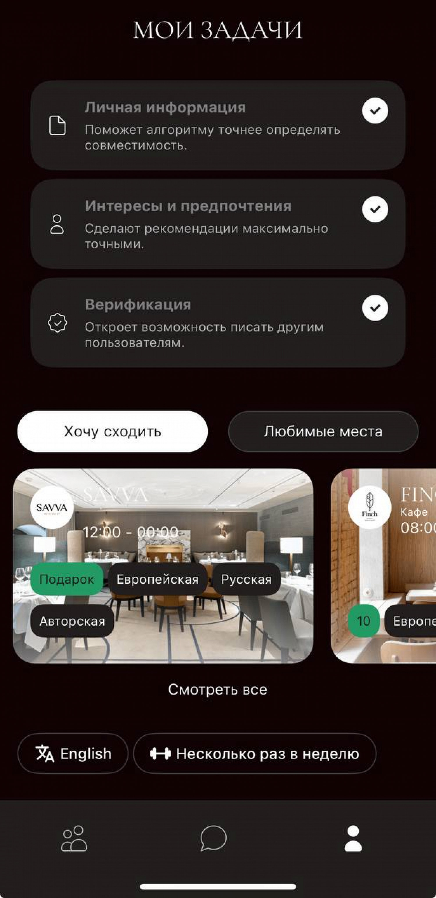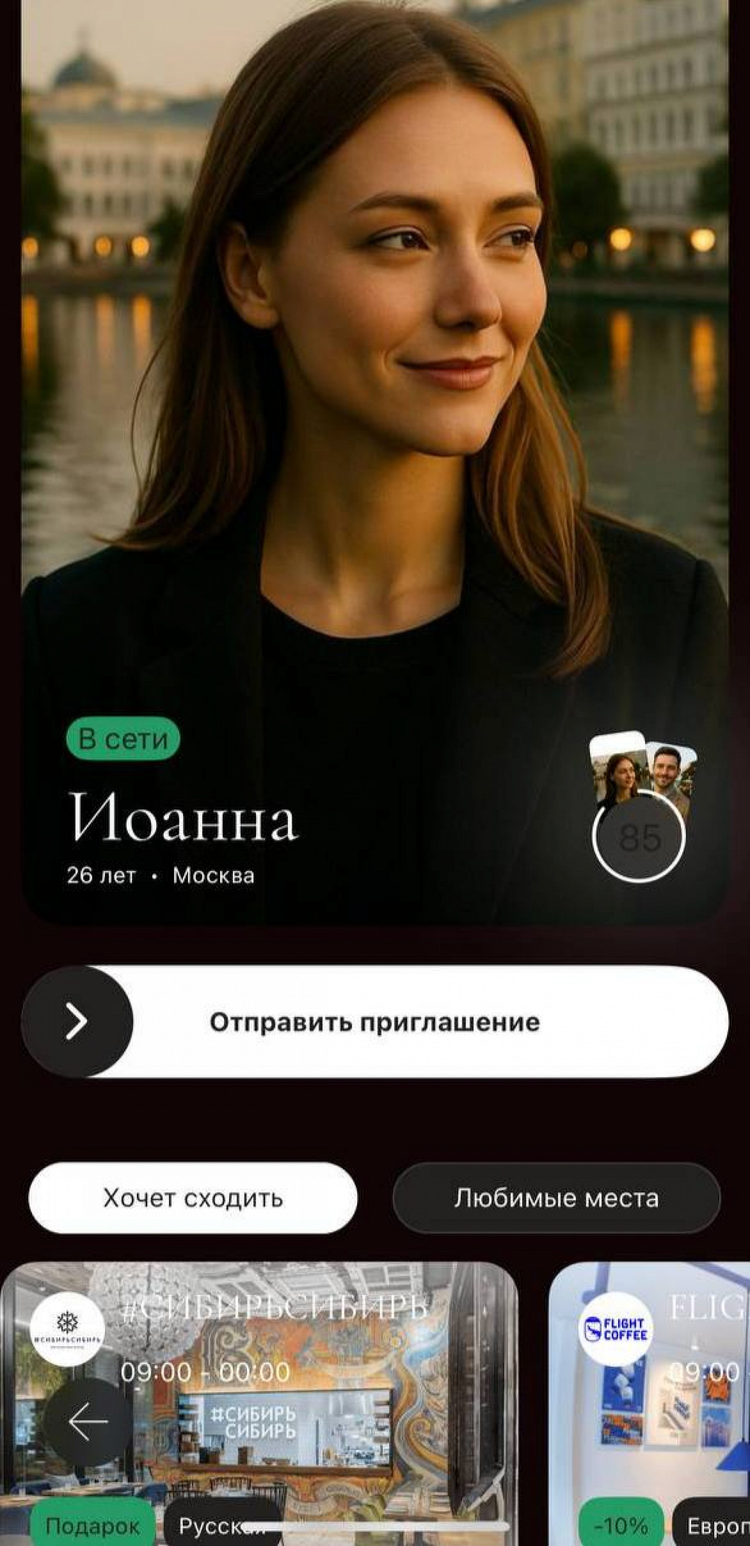 Система приглашений в сервисе позволяет договориться о совместном походе в кафе, ресторан или бар, а разговорный ИИ-помощник поможет четко сформулировать мысль, тактично подсветить красные флажки в переписке, мягко отфильтровать токсичных собеседников, подсказать темы для диалога и тон общения.