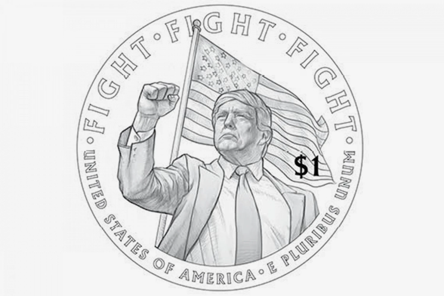На оборотной стороне изображен Трамп с поднятым вверх кулаком на фоне американского флага. В верхней части расположены слова «Fight, Fight, Fight», внизу написано «United States of America» и другой девиз США — «E Pluribus Unum» (с лат. из многих — единое).