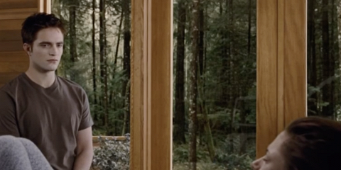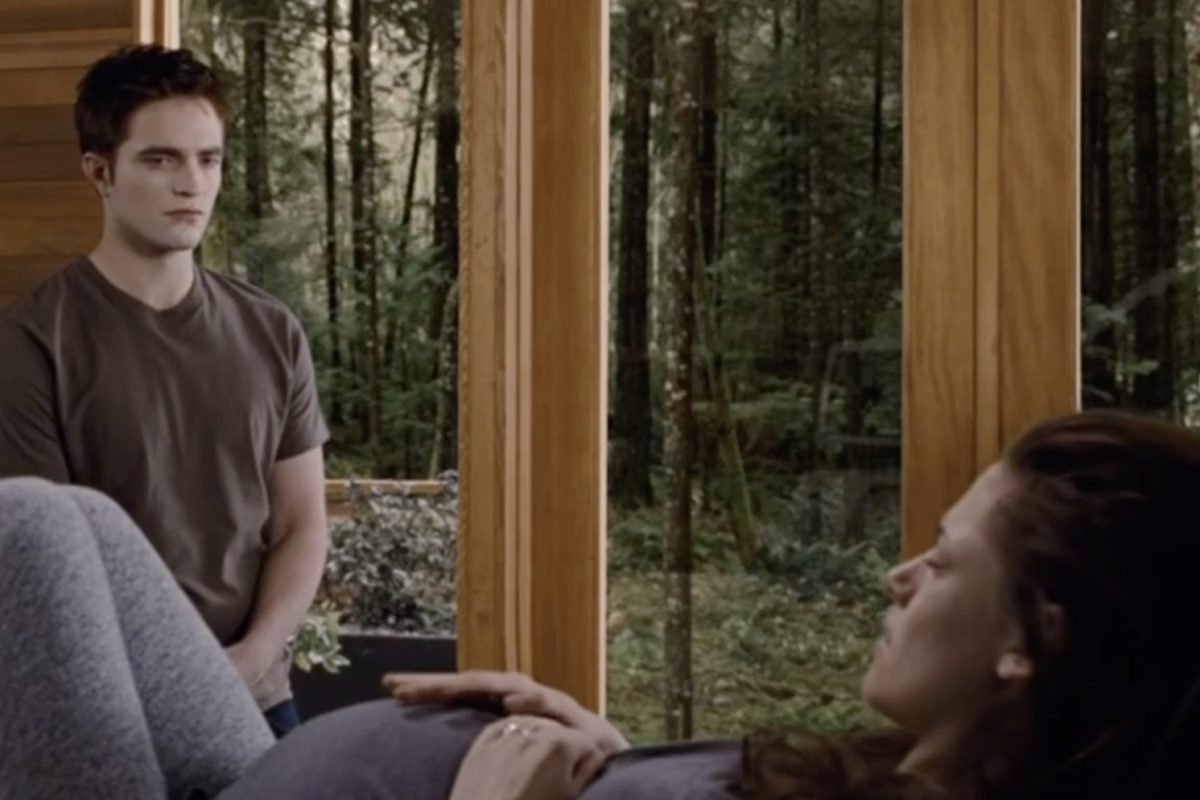 В сцене вампир Эдвард отворачивается к окну от беременной Беллы Свон — и в этот миг на лице Паттинсона появляется ухмылка, будто он пытается скрыть свой смех.