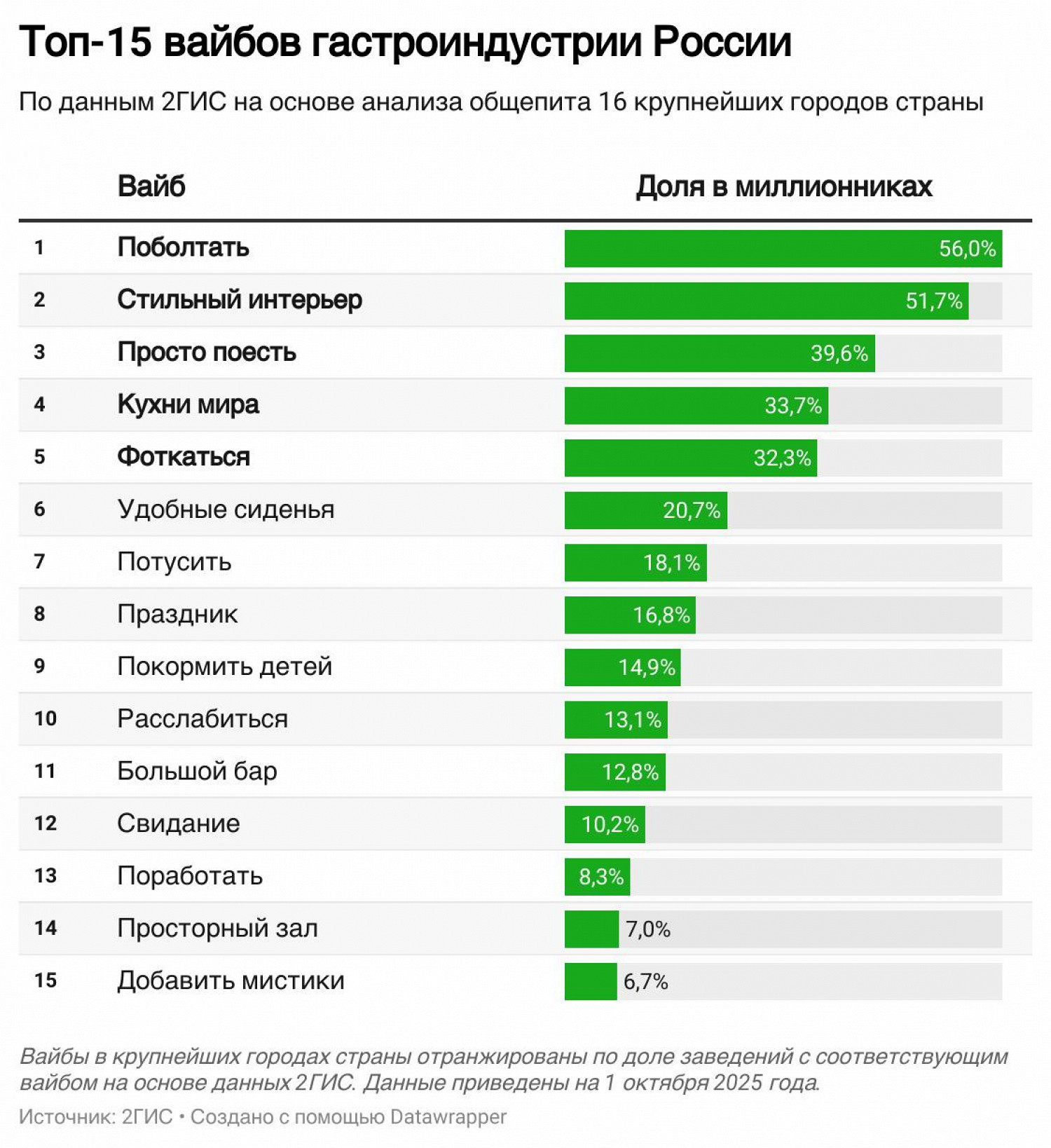 Каждое четвертое место также советует себя тем, кого интересует вайб «Потусить». Кроме того, Москва вошла в топ-5 городов по распространенности заведений с самым утилитарным вайбом — «просто поесть». Его предлагают 40% локаций.