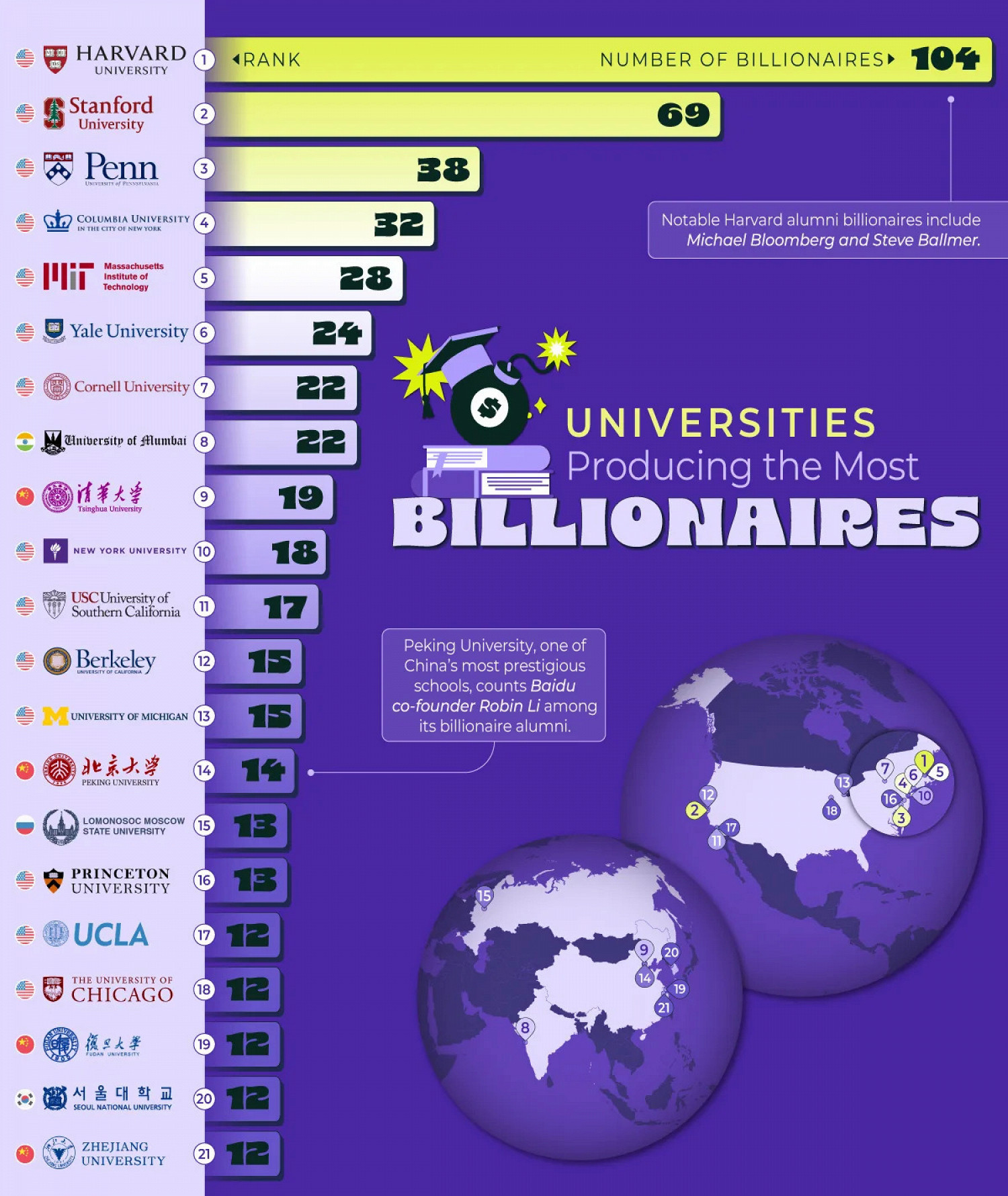 Первое место занимает Гарвард, выпустивший 125 миллиардеров, чье совокупное состояние составляет почти 600 млрд долларов. За ним идут Стэнфорд (69 миллиардеров) и Университет Пенсильвании (38 миллиардеров).