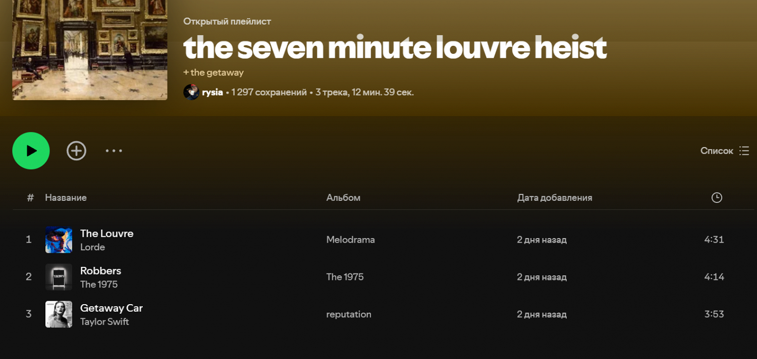 В Spotify появился плейлист «Семь минут на ограбление Лувра». Его составила пользователь с ником @rysia. В подборку вошли три трека с тематическими названиями: «Лувр» певицы Лорд, «Грабители» группы The 1975 и «Машина для побега» Тейлор Свифт.