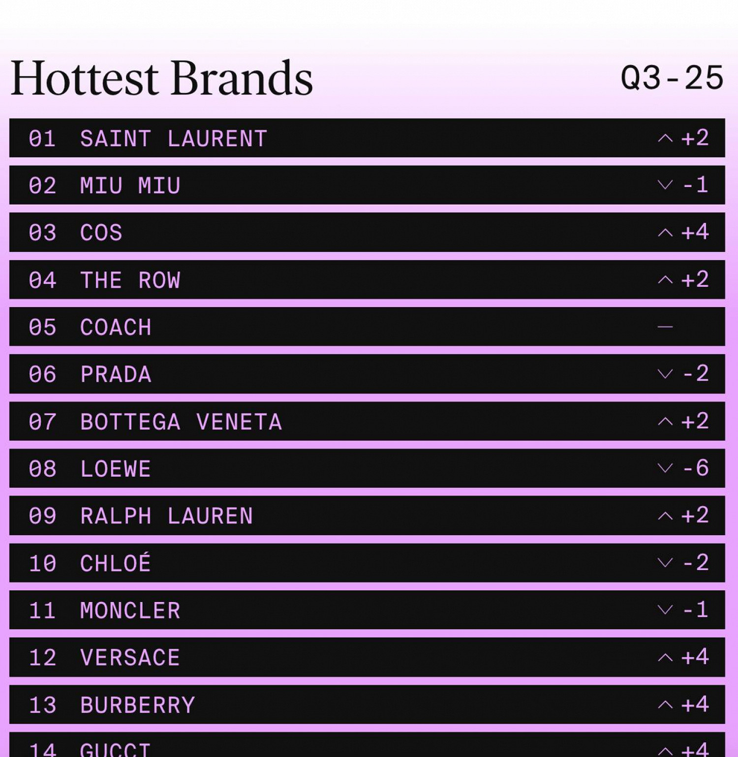 На втором месте расположился прошлогодний лидер — бренд Miu Miu. Тройку лидеров замкнул Cos, совершивший рывок на четыре позиции вверх.