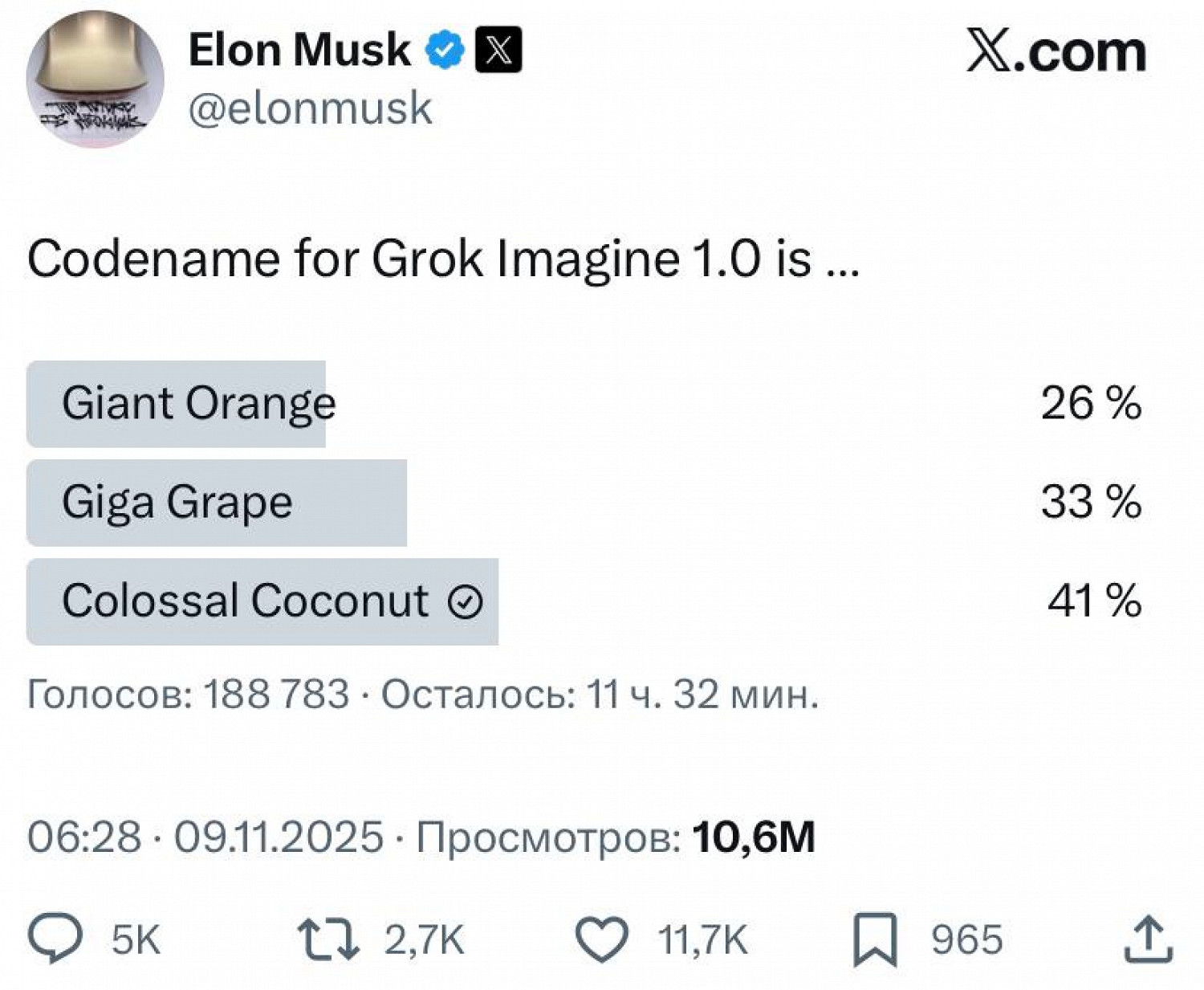Предприниматель Илон Маск создал голосование в соцсети X за кодовое имя для версии 1.0 генератора видео Grok Imagine.