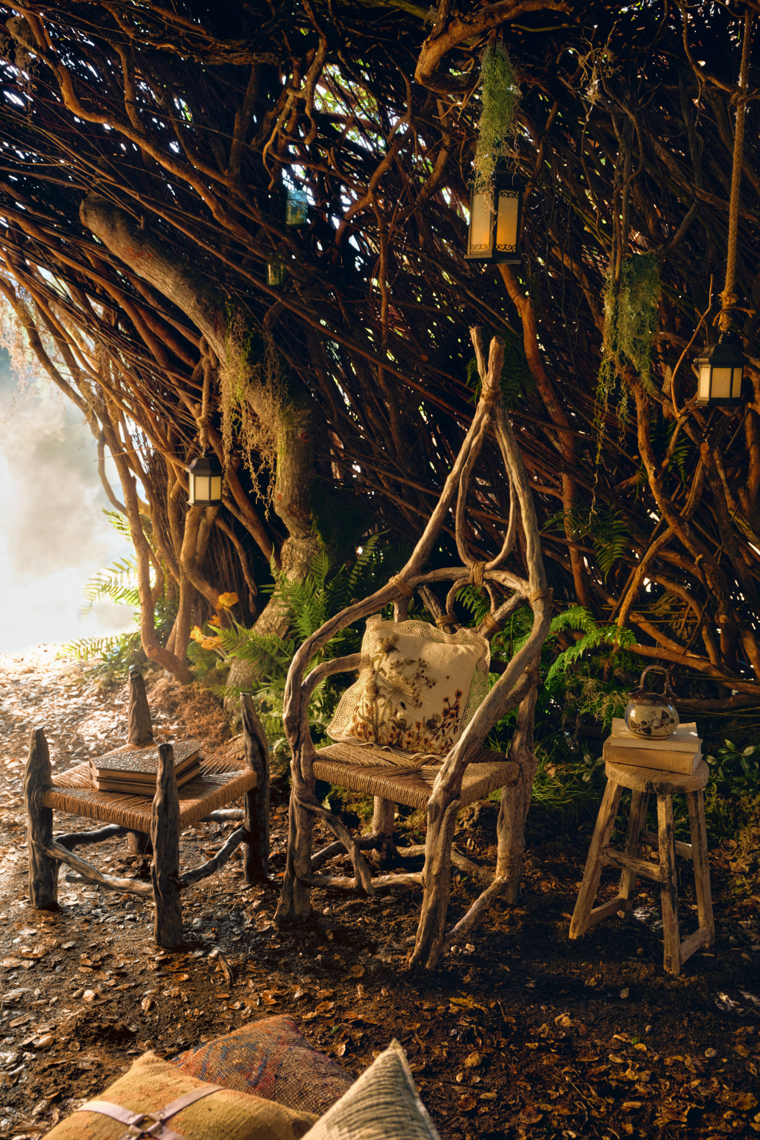 Дом находится в городе Таузенд-Оукс в Калифорнии. Его крышу и стены образуют деревья и лозы. Интерьер тоже напоминает лес: вся мебель изготовлена из коричневого дерева, повсюду зеленые растения, а освещение создается с помощью фонарей.