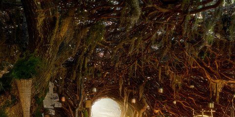Дом находится в городе Таузенд-Оукс в Калифорнии. Его крышу и стены образуют деревья и лозы. Интерьер тоже напоминает лес: вся мебель изготовлена из коричневого дерева, повсюду зеленые растения, а освещение создается с помощью фонарей.