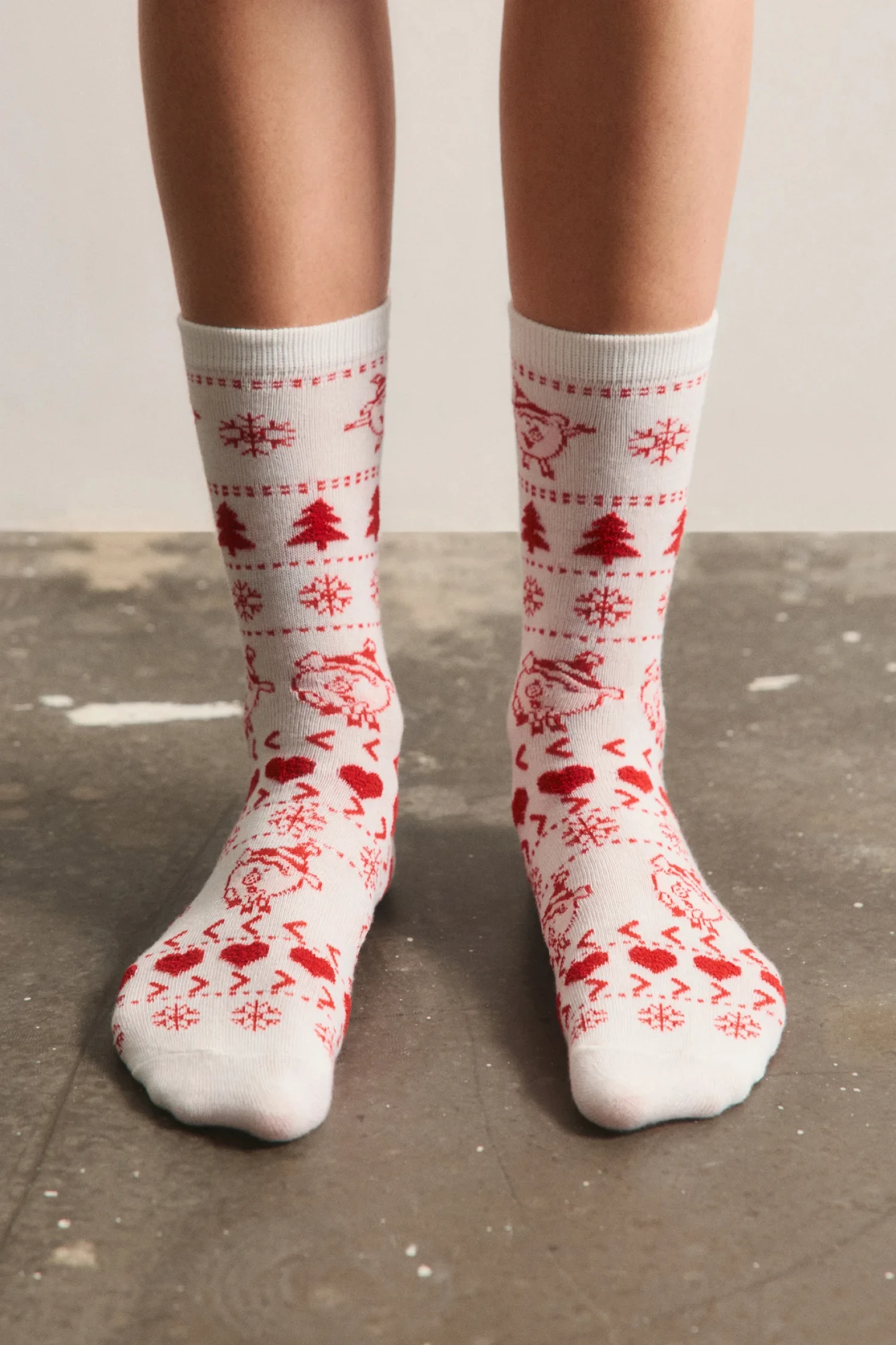В коллекции есть два комплекта пижам, состоящих из рубашки и брюк, в белой и красной цветовой гамме. На них изображены снежинки, подарки, елки и, конечно, персонажи «Смешариков», занятые зимними делами, например катанием на лыжах.