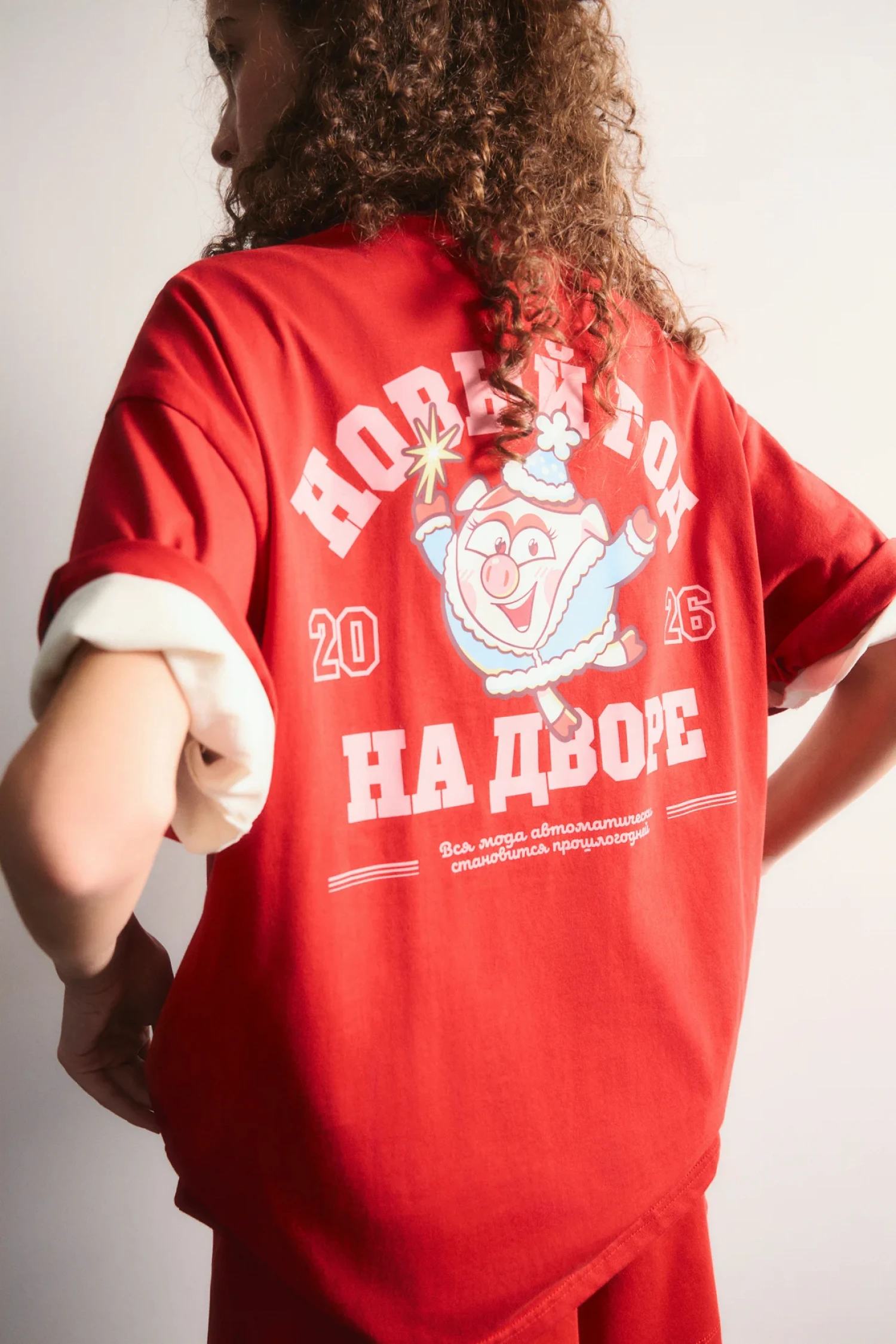 На футболках персонажи изображены в зимнем, новогоднем сеттинге. На одной из них все смешарики сидят за праздничным столом с елкой, оливье и бенгальскими огнями. Под изображением красуется надпись: «Новый год сам себя не отпразднует». На другой — Нюша в шапке Деда Мороза и синей шубке с подписью «Новый год на дворе».