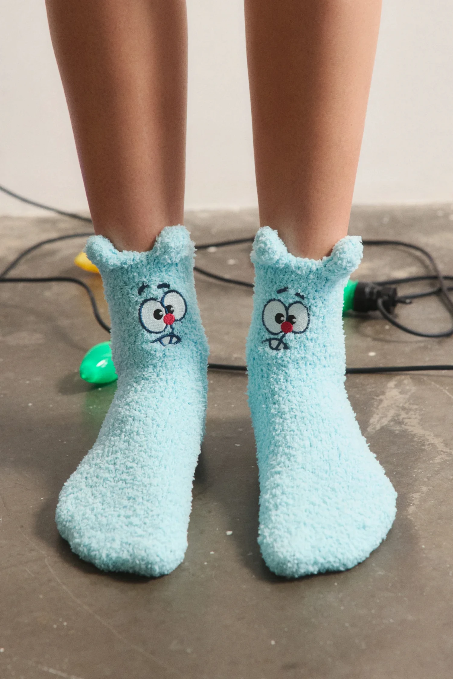 Большое внимание уделено аксессуарам: представлены как носки с вышивкой, так и махровые. Особого внимания заслуживают два длинных шарфа в клетку с плетеной бахромой-косичкой на конце. На шарфах закреплены патчи с Пином или Нюшей. Другие предметы коллекции — фиолетовые митенки с Барашем и огромные тапки с Крошем.
