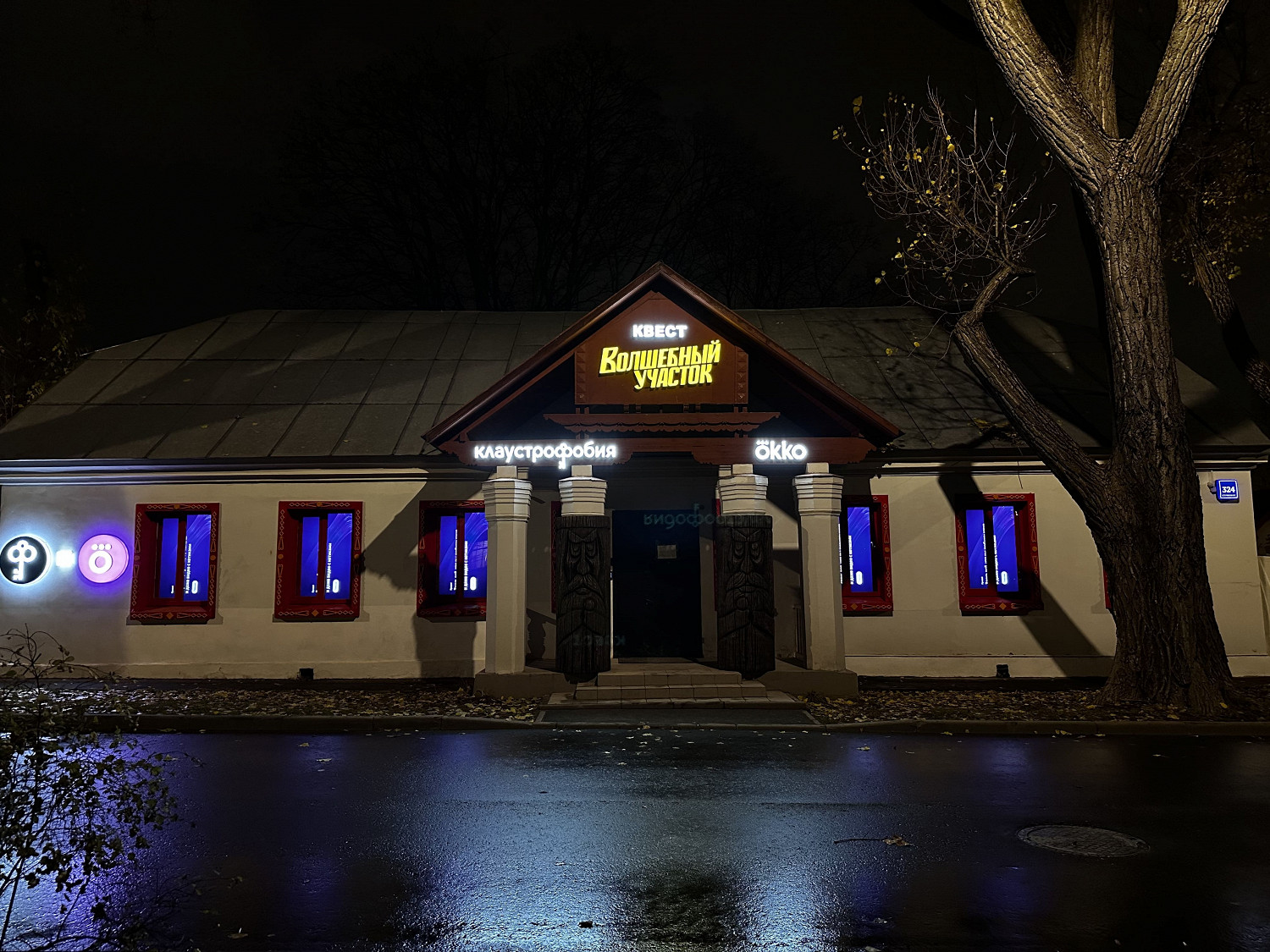 Фасад здания украшен постером сериала с Лехой, сжимающим в руках меч-кладенец; на крыше сидит приспешник Кощея — Ворон; при входе их встречает логотип Okko и множество других артефактов, которые волшебным образом откроются, если правильно выстроить уменьшенную копию участка.