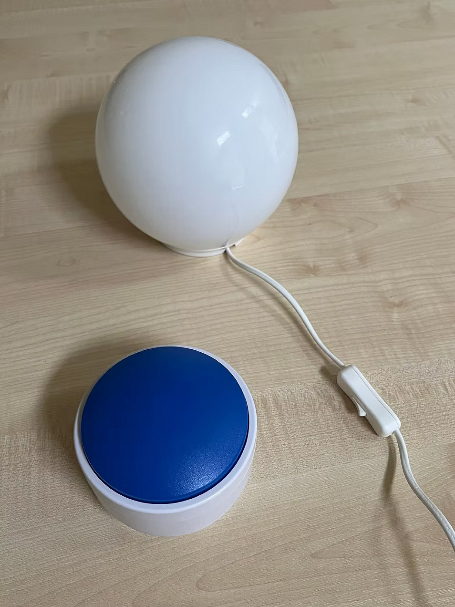 Кнопка синяя, поскольку этот цвет лучше всего различим собачьим зрением. Устройство реагирует на нажатие носом или лапой. Его можно закрепить на любой поверхности, например, на стене или полу. Размеры кнопки подобраны с учетом удобства для собак разных габаритов. При успешной активации устройство подает сигнал подсветкой, но не слишком яркой.