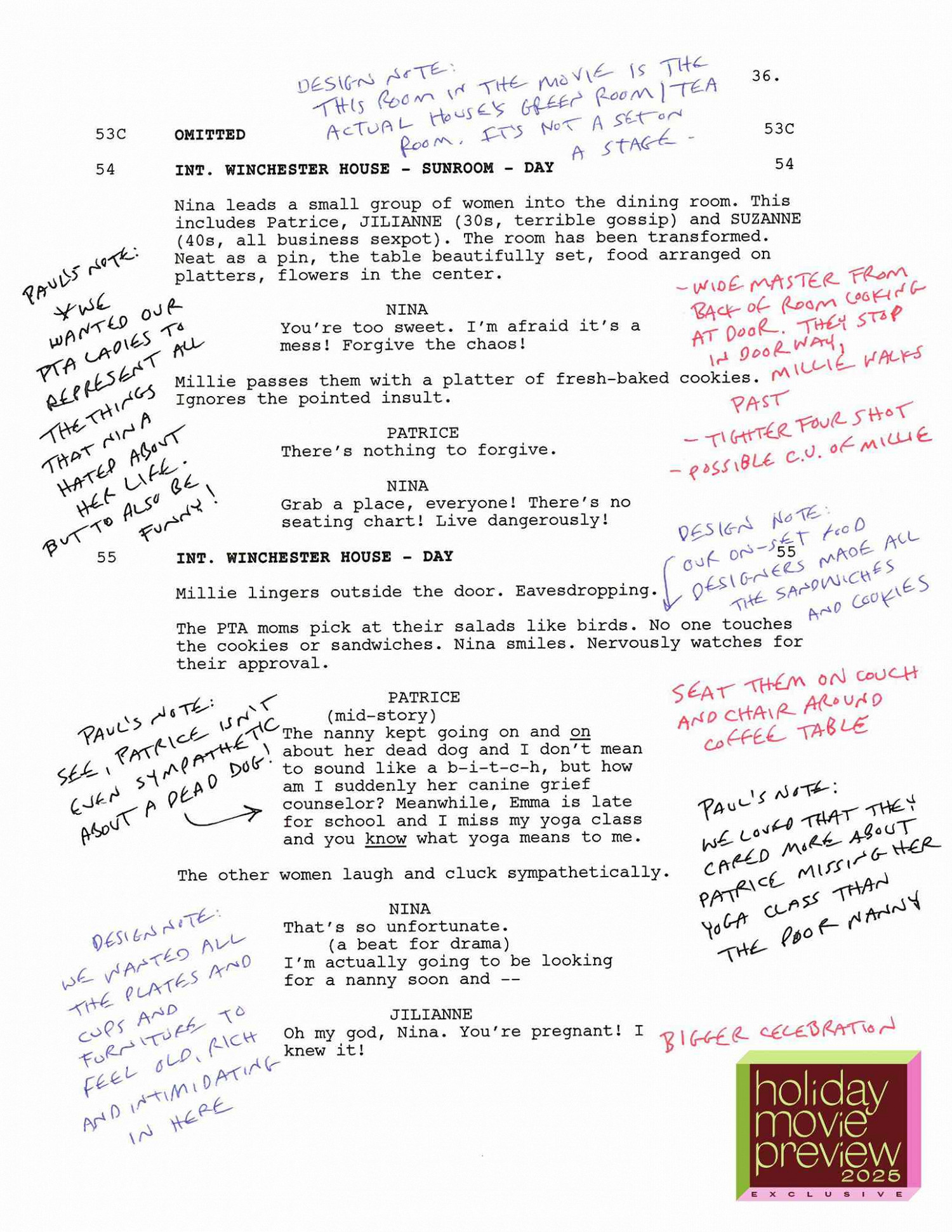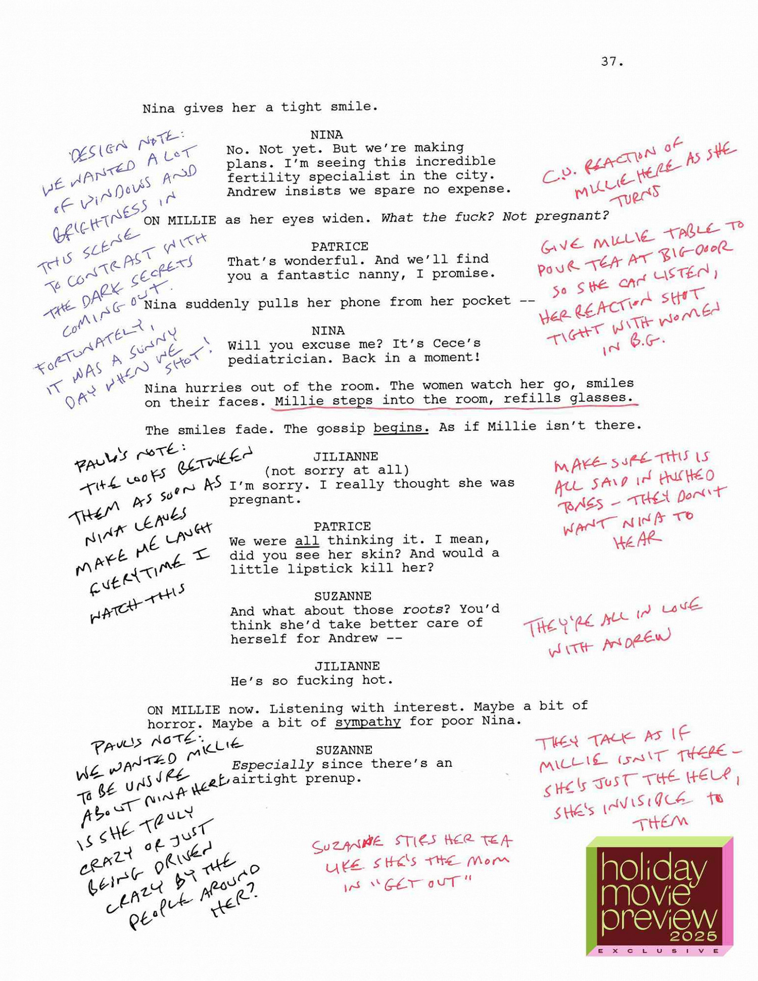 В опубликованном фрагменте героиня Сейфрид делится с подругами, что им с мужем вскоре понадобится няня, так как они планируют визит к специалисту по фертильности. Едва она отходит, подруги начинают обсуждать ее внешность. Этот разговор подслушивает героиня Суини, делая вид, что наливает женщинам чай.