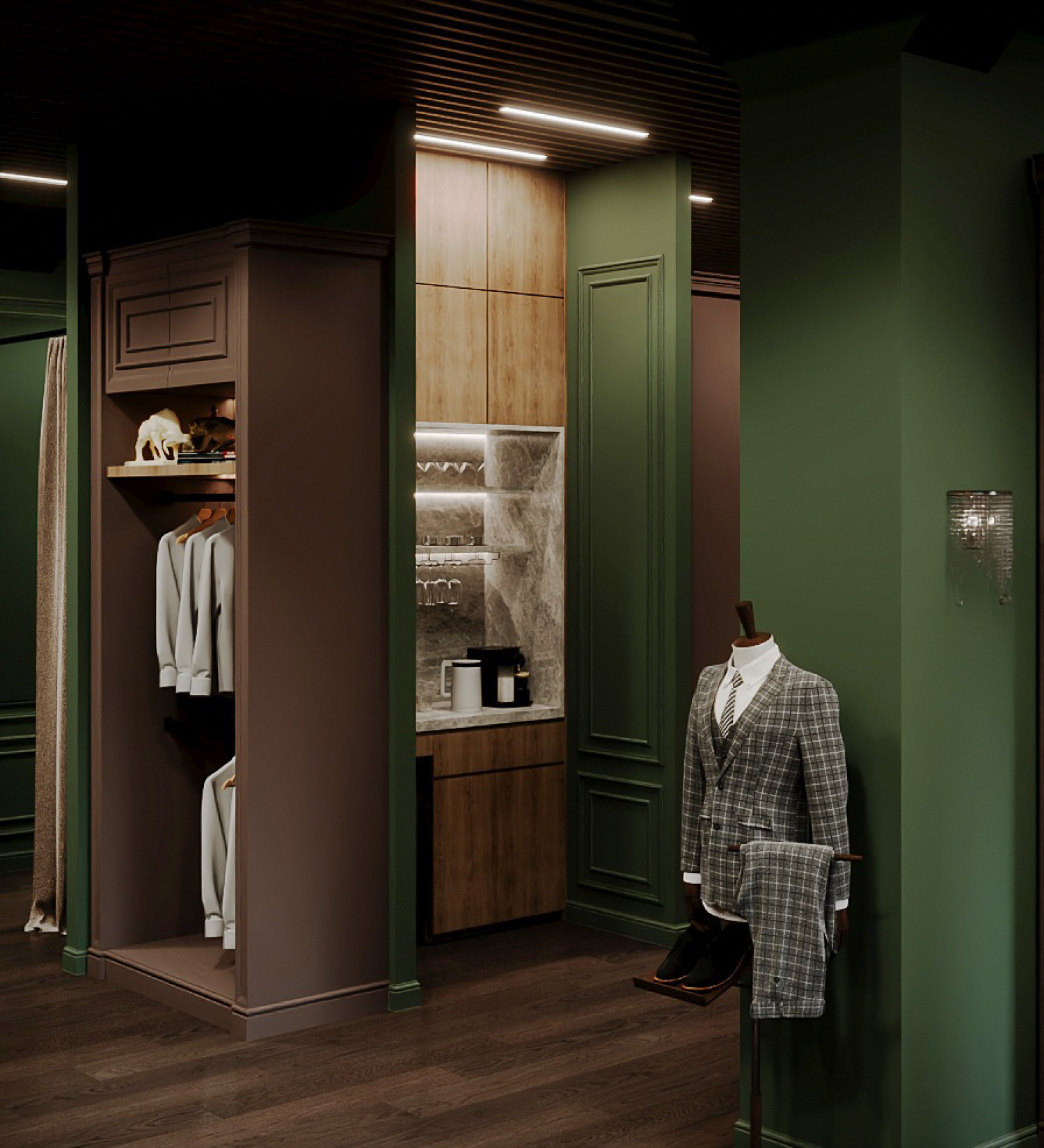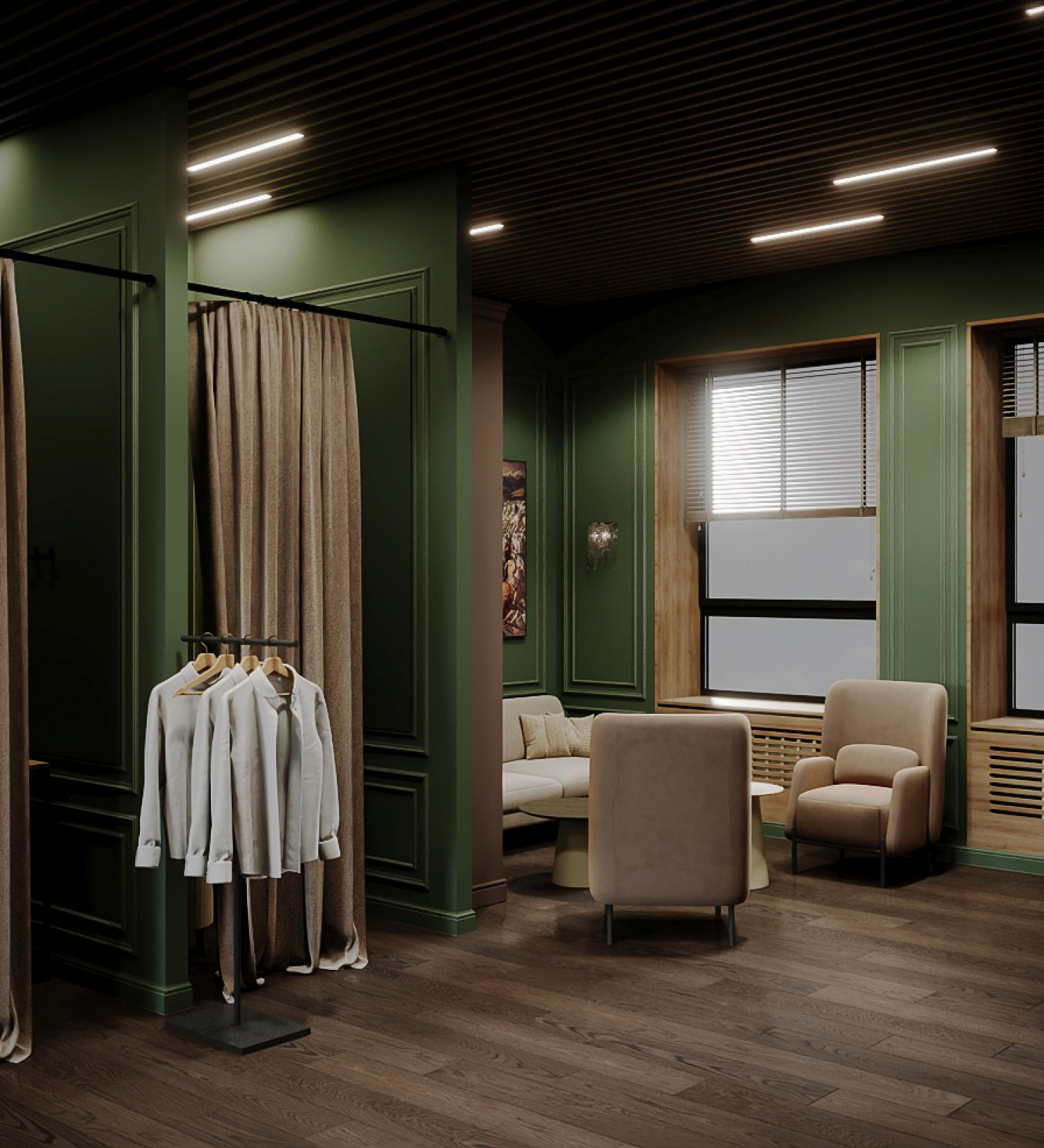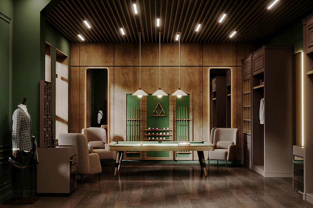 В отделке использованы благородные породы дерева и глубокие зеленые тона. Одной из особенностей бутика станет зона отдыха с бильярдным столом.