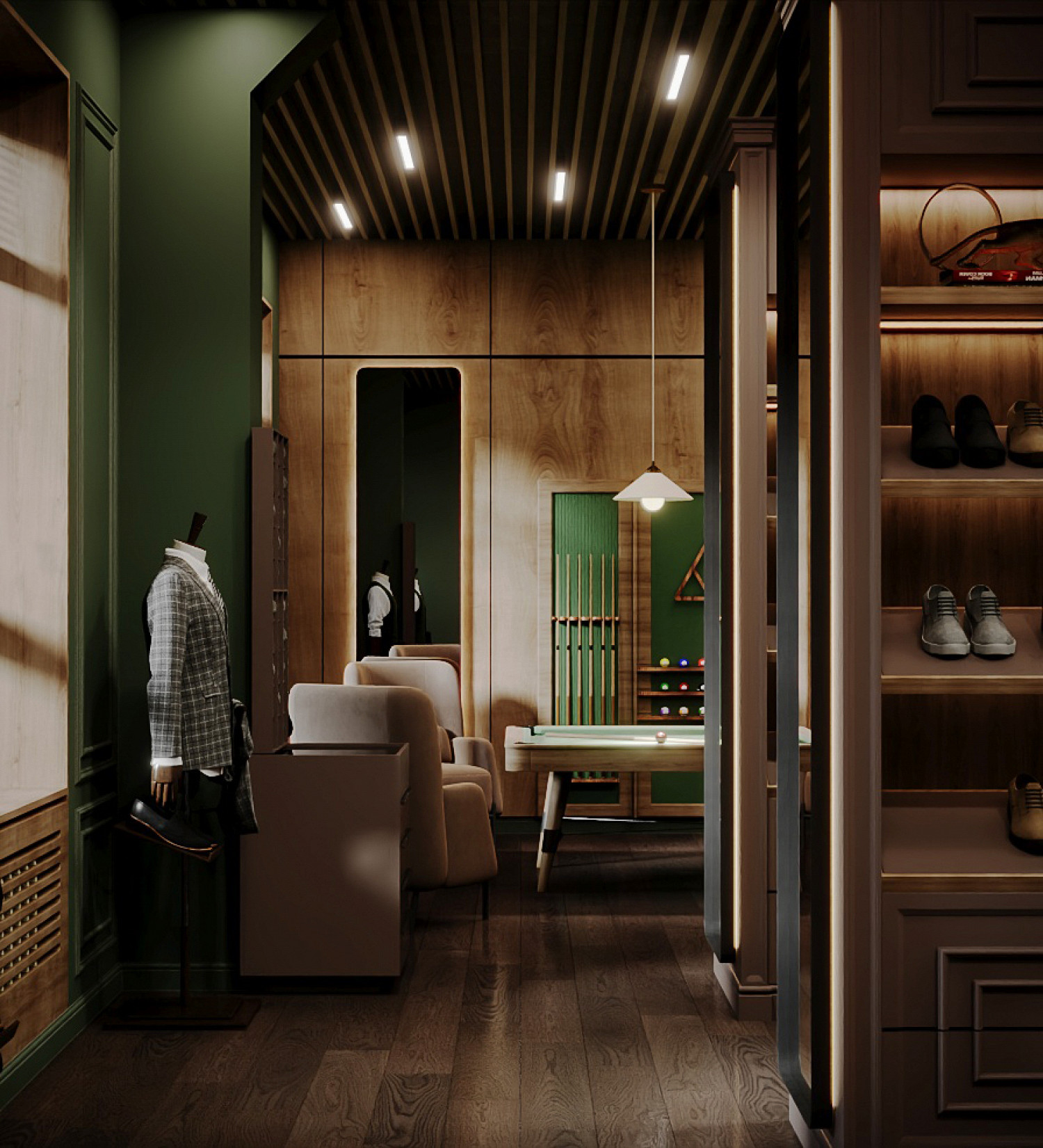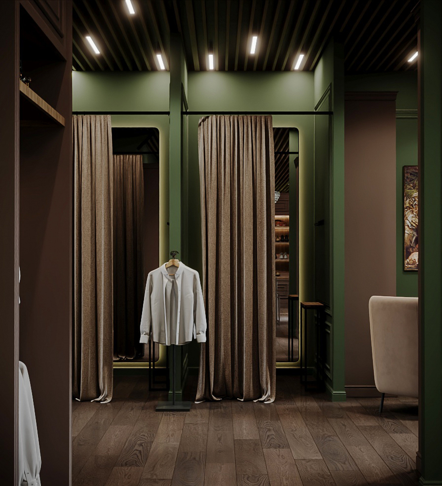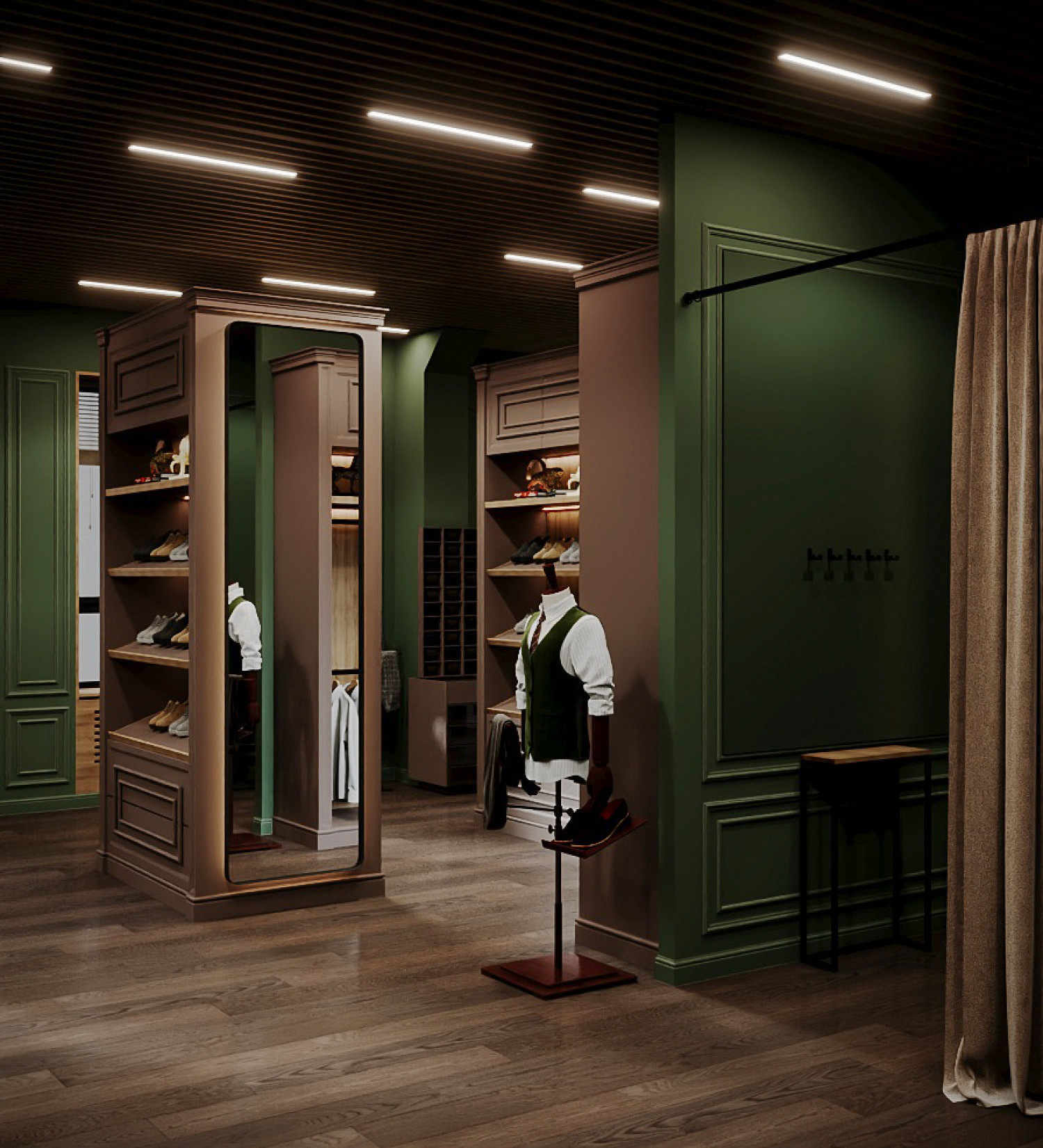 В отделке использованы благородные породы дерева и глубокие зеленые тона. Одной из особенностей бутика станет зона отдыха с бильярдным столом.