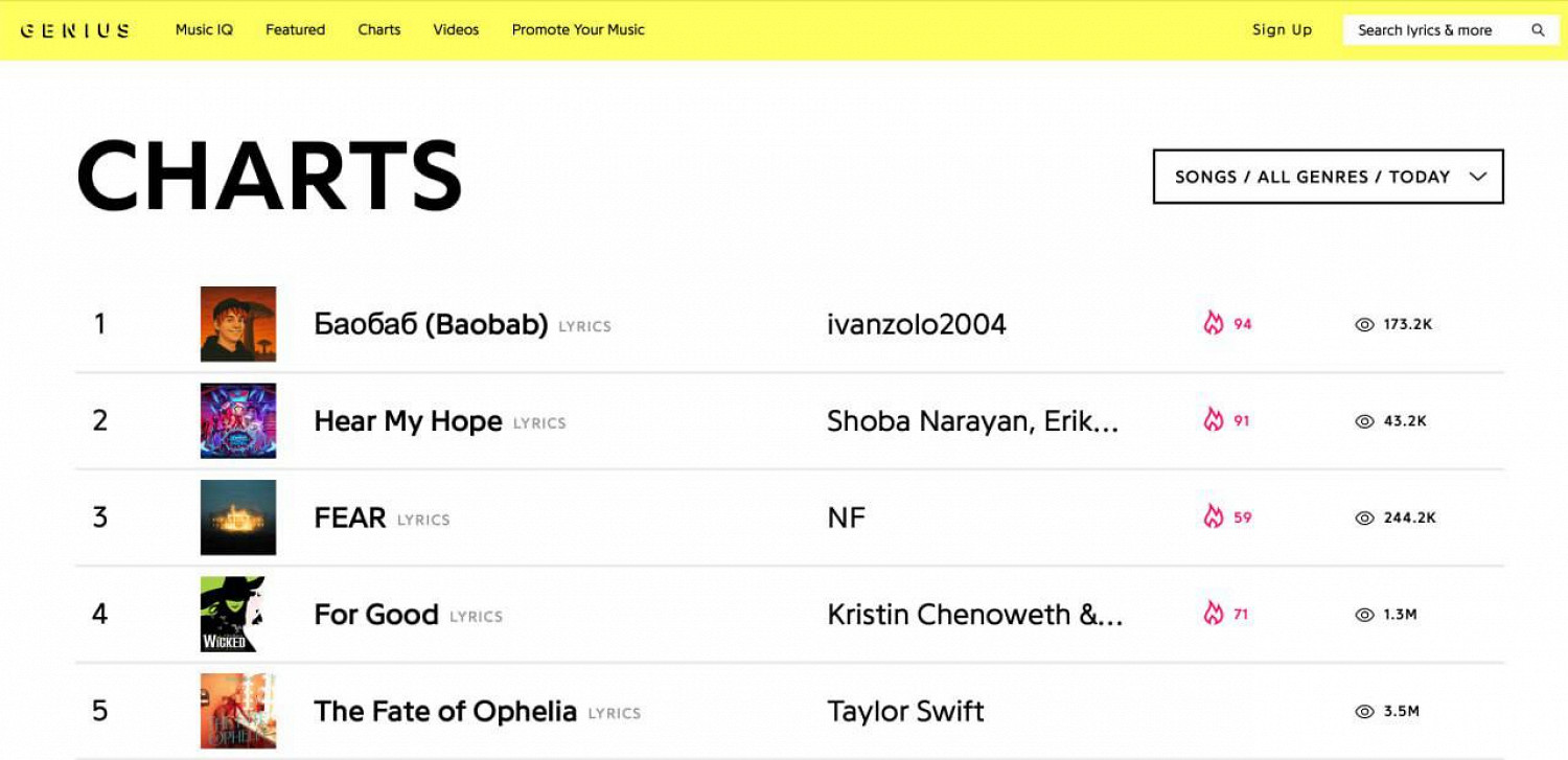 Genius — американский сайт, основанный в 2009 году. На нем пользователи составляют аннотации и интерпретации текстов песен. Ранее из русскоязычных артистов в топ чарта Genius попадали Макс Корж, GONE.Fludd и Big Baby Tape.